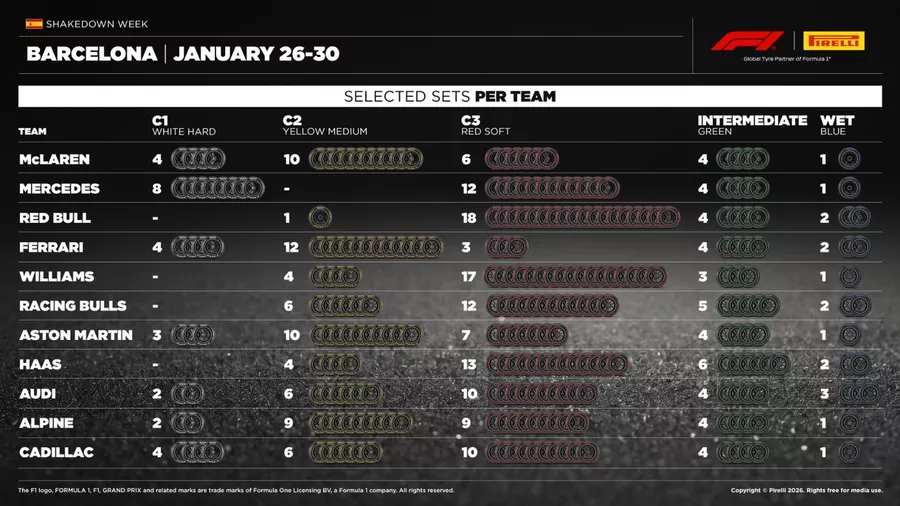 Pirelli mengumumkan pilihan ban yang dipilih oleh tim untuk Shakedown F1 di Barcelona yang akan berlangsung 26-30 Januari. Ferrari sangat mengandalkan ban C2, sementara Red Bull dan Mercedes menonjol dengan pilihan ban C3 yang lebih banyak.