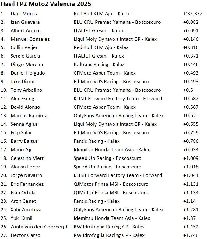 ![]() Daniel Munoz mencatatkan namanya dalam buku rekor Moto2 Valencia, setelah tampil memukau di akhir sesi. Kondisi tak terlalu berubah banyak di Sirkuit Riccardo Tormo, Sabtu (15/11/2025), dibanding sesi sebelumnya. Ayumu Sasaki dinyatakan tidak fit dan harus mundur dari semua sesi yang tersisa karena patah pergelangan kaki. Pebalap RW-Idrofoglia Racing GP itu mengalami kecelakaan di Tikungan 6 pada FP1. Insiden yang sama membuat Adrian Huertas harus dioperasi karena dua lengannya patah. Jake Dixon, yang menjalani sesi-sesi terakhirnya di Moto2 sebelum pindah ke WSBK, segera mengambil posisi teratas. Ia membukukan 1:32,865 pada putaran kedua. Diogo Moreira yang tampil tak maksimal dalam Practice dan gagal lolos ke Q2 langsung, membalas di sesi ini. Pebalap Italtrans asal Brasil melesat ke puncak dengan 1:32,818. Sergio Garcia mengambil alih posisi pertama di paruh kedua setelah mencatatkan 1:32,743. Mario Suryo Aji pun unjuk gigi di periode ini dengan terbang ke P12, tertinggal 0,5 detik dari pemuncak tabel. Manuel Gonzalez menunjukkan daya saingnya saat sesi tinggal delapan menit. Penantang juara Moto2 tersebut naik ke urutan pretama, yang sayangnya, dikudeta oleh Izan Guevara yang mencetak 1:32,459, diturunkan lagi 0,004 detik. ManuGas berada di P3 usai Albert Arenas melewatinya. Setelah waktu habis, sesi penentuan posisi mencapai puncaknya ketika Daniel Munoz berhasil mencuri posisi tertinggi berkat catatan waktunya yang impresif. Ia membukukan raihan 1:32,372, sebuah angka yang langsung menegaskan dominasinya pada akhir sesi. Keberhasilannya tersebut juga sekaligus menandai tercapainya rekor waktu lap terbaru di trek Cheste yang dikenal menuntut ketepatan tinggi. Catatan Munoz itu bukan hanya sekadar waktu cepat, tetapi juga menggambarkan konsistensi dan keberaniannya memaksimalkan performa motor saat tekanan berada di puncak. Dengan kondisi lintasan yang menuntut fokus penuh, torehan tersebut semakin memperkuat reputasinya sebagai pebalap yang mampu tampil menonjol di momen-momen kritis, terutama ketika para pesaing lain juga berupaya meningkatkan waktu. Di belakang Munoz, Izan Guevara harus rela menempati posisi kedua meskipun sempat menunjukkan potensi besar untuk menantang posisi teratas. Performa kuatnya tidak cukup untuk menggeser waktu terbaik yang dicatatkan Munoz. Sementara itu, Albert Arenas tampil stabil untuk mengamankan posisi ketiga, menunjukkan daya saing yang solid di antara para pebalap papan atas. Manuel Gonzalez lalu menyusul di urutan berikutnya, diikuti Collin Veijer yang juga mencatat waktu kompetitif. Sergio Garcia dan Diogo Moreira turut mengisi barisan pebalap dengan performa konsisten. Kemudian, Daniel Holgado menambah kedalaman persaingan, sementara Jake Dixon memastikan dirinya tetap berada dalam kelompok cepat bersama Tony Arbolino yang melengkapi daftar sepuluh besar. Di sisi lain, Mario Suryo Aji masih berupaya menemukan ritme terbaiknya dan menutup sesi di posisi ke-17. Meskipun belum menembus sepuluh besar, posisinya mencerminkan usaha keras untuk terus meningkatkan kecepatan menghadapi persaingan yang sangat ketat. Penampilannya tetap memberi gambaran tentang peluang berkembang pada sesi-sesi selanjutnya di lintasan. ![]() Sumber : id.motorsport.com