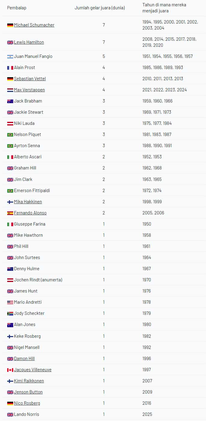 ![]() Lando Norris kini menjadi nama terbaru yang masuk dalam daftar eksklusif para pebalap yang berhasil meraih gelar juara dunia Formula 1. Pencapaiannya tidak hanya menambah panjang daftar tersebut, tetapi juga menegaskan betapa sulitnya menjadi kampiun di ajang balap paling bergengsi di dunia. Gelar yang diraihnya pada 2025 menempatkan Norris sejajar dengan para legenda F1 sebelumnya. Sepanjang sejarah panjang Formula 1, lebih dari 750 pebalap telah turun berlaga sejak kejuaraan ini pertama kali digelar. Mereka datang dari berbagai generasi, tim, dan latar belakang berbeda, membawa ambisi besar untuk mengukir sejarah dalam kompetisi yang memadukan kecepatan ekstrem, strategi matang, dan konsistensi tinggi di setiap musimnya. Namun, meskipun jumlah pebalap yang pernah mencicipi kerasnya persaingan F1 sangat banyak, hanya sebagian kecil yang berhasil mencapai puncak prestasi. Ada banyak faktor yang membuat gelar juara dunia begitu sulit diraih, mulai dari kemampuan teknis, dukungan tim, keandalan mobil, hingga ketenangan ketika menghadapi tekanan intens sepanjang musim. Dari ratusan pebalap tersebut, hanya 35 orang yang mampu memenangi kejuaraan dunia setidaknya satu kali dalam karier mereka. Angka ini menunjukkan betapa eksklusifnya gelar tersebut dan betapa dominannya beberapa nama besar dalam berbagai era, yang membuat persaingan menuju puncak menjadi semakin menantang bagi generasi baru F1. Lando Norris, yang meraih gelar pertamanya pada 2025, menjadi juara dunia terbaru yang masuk dalam daftar tersebut. Keberhasilannya melengkapi deretan pebalap yang mampu menjadi kampiun setelah melewati satu musim penuh. Dengan pencapaian ini, Norris tidak hanya mengukir sejarah pribadi, tetapi juga memperkaya daftar pebalap elite yang pernah menyandang gelar juara dunia Formula 1. Ke-34 juara dunia Formula 1 dan jumlah titel : ![]() Impian setiap pebalap adalah melakukan debut Formula 1, untuk mencapai kelas teratas dengan mobil-mobil tercepat, pebalap terbaik, dan semua kehebatan yang ada di puncak motorsport. Mimpi yang lebih besar adalah memenangi balapan, menjadi orang pertama yang melihat bendera finis, mendapat ucapan selamat dari seluruh dunia, dan berdiri di podium teratas untuk mendengarkan lagu kebangsaan. Namun, para pebalap yang tidak puas dengan impian kecil ini memiliki tujuan yang lebih besar: menjadi juara dunia Formula 1. Tidak banyak yang berhasil mencapainya, dan di sini kami ingin memberikan penghormatan kepada semua juara F1 dalam sejarah. 35 pebalap telah berbagi 75 gelar Formula 1 sejauh ini. Sebanyak 35 pebalap juara dunia F1 dari 15 kebangsaan yang berbeda dan 16 negara yang berbeda (untuk Inggris, pebalap Inggris dan Skotlandia telah menang). Yang paling sukses adalah Michael Schumacher dan Hamilton. Michael Schumacher pada 2002 menyamai Juan Manuel Fangio, yang pada saat itu merupakan pebalap dengan mahkota terbanyak, dan kemudian memenangi dua gelar lagi untuk menggenapkan jumlah gelar juara menjadi tujuh. Hamilton menambah gelar juara dari tahun ke tahun dan menyamai rekor ‘Schumi‘ pada 2020. Pada 2021, pebalap Inggris itu ingin menyalip rekor Kaiser dan menjadi pemuncak klasemen dengan rekor baru delapan gelar, tetapi Max Verstappen dan Red Bull mencegahnya melakukannya, dalam mahkota pertama pebalap muda asal Belanda itu. Dengan keluarnya Mercedes dari pertarungan, tahun 2022 dan 2023 menjadi perjalanan yang lebih mulus bagi Max Verstappen, yang menjadi juara tiga kali. Setelah menjadi juara F1 empat kali pada 2024, ia mempertahankan daftar pebalap yang telah memenangi setidaknya satu gelar Formula 1 di usia 34 tahun. Lando Norris bergabung dalam daftar sebagai pebalap Inggris ke-11 yang memenangi gelar juara dunia setelah mengalahkan Verstappen dan Piastri, menambah jumlah juara menjadi 35. Sebelum Norris, pebalap terakhir yang masuk dalam daftar ini adalah Verstappen dan, sebelum itu, Nico Rosberg, yang sampai saat ini adalah pebalap terakhir yang memenangi gelar juara dunia dan tidak pernah memenangkannya lagi (dalam kasusnya karena dia sudah pensiun), tetapi masih harus dilihat apakah Lando Norris akan meraih atau mencuri penghargaan yang langka dan sangat tidak diinginkan ini. Sumber : id.motorsport.com