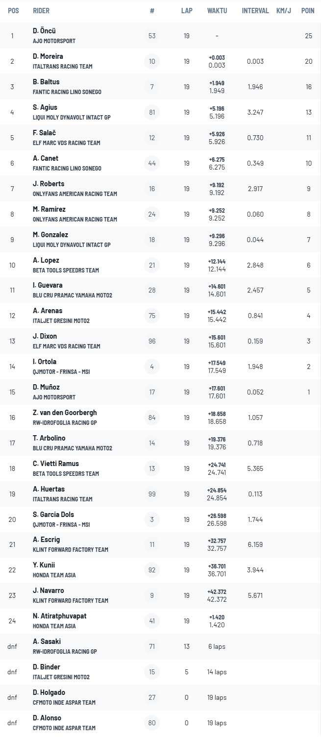 ![]() Deniz Oncü menjadi pebalap Turki pertama yang menang di Moto2 setelah mengalahkan Diogo Moreira secara berdampingan di garis finis MotorLand Aragon, Minggu (8/6/2026), dengan selisih 0,003 detik, selisih paling tipis dalam sejarah. Deniz Oncu kemenangan pertamanya di Moto2 Aragon -sesuatu yang belum pernah dilakukan oleh pebalap Turki sebelumnya- setelah mengalahkan Diogo Moreira dengan jarak yang sama di garis finis. Pebalap Brasil itu sempat memimpin setelah melewati lap terakhir, tetapi rider #53 tidak menyerah dan, dengan aksi terakhir yang luar biasa, mengalahkan rivalnya melalui foto finish. Dalam perebutan gelar juara, Aron Canet finis urutan keenam dan Manu Gonzalez naik ke posisi kesembilan, membuat keduanya memiliki poin yang sama, 119. Balapan kategori intermediate, seperti halnya Moto3, berlangsung dalam cuaca yang sempurna untuk bersepeda motor, meski cuaca mulai memanas seiring berjalannya waktu, selepas tengah hari. Di awal balapan, Diogo Moreira berhasil merebut posisi terdepan dari Deniz Oncu dan Barry Baltus, namun pebalap asal Turki dan Belgia itu berhasil menyalipnya setelah beberapa tikungan. Aron Canet berada di urutan keempat, di depan Filip Salac. Terjadi kecelakaan antara dua rekan setimnya di Tim Aspar yang memulai balapan dari baris kedua. Daniel Holgado terlalu optimis dalam upaya menyalip dan akhirnya terjatuh, membawa serta David Alonso. Insiden ini diselidiki oleh para steward dan sang juara bertahan Moto3 dibawa ke pusat medis. Sementara semua itu terjadi, Manu Gonzalez, sang pemimpin klasemen, mulai bangkit kembali, dan setelah dua lap sudah berada di posisi ke-14. Di depan, Baltus berhasil merebut posisi dari Oncu dan naik ke posisi pertama. Sementara, Canet mulai menekan untuk mengejar tiga pebalap di depannya. Bahkan, di lap ketiga ia berhasil menyalip Moreira dan mengejar dua pebalap terdepan. Pebalap asal Valencia itu berhasil mengejar dan melewati Oncu di lap keenam dari 19 lap yang direncanakan, dan terus mengejar rekan setimnya sambil menjaga agar pebalap asal Turki dan Brasil itu tetap berada di belakangnya. Di belakang, Gonzalez terus menambah posisi dan naik ke urutan kesebelas, di belakang rekan setimnya di Onlyfans American Racing Team, Marcos Ramirez dan Joe Roberts. Aksi berlanjut di bagian depan balapan, dengan Baltus, Oncu, Moreira dan Canet memimpin satu detik di depan para pesaingnya. Canet tidak mampu memimpin, dan setelah melewati pertengahan lomba, Oncu dan Moreira kembali memimpin. Bahkan, sejak saat itu, Baltus dan Oncu membuka jarak empat persepuluh detik dari dua pebalap lainnya, sementara Salac dan Lopez berusaha mengejar Canet. Namun, pebalap tercepat di lintasan berada di belakang: Gonzalez, yang berada di urutan kesembilan dan mencoba melakukan kontak dengan grup kedua. Pada awal lap 13 terjadi pergantian pemimpin. Oncu menekan karena melihat bannya tidak kempes dan melewati Baltus tanpa masalah berarti. Dari sana, ia mulai menekan dan melakukan putaran cepat, mencatatkan waktu 1:50, untuk menyulitkan pebalap Belgia dan Moreira. Canet tidak bisa mengikuti kecepatan dan tertinggal di posisi tak bertuan, di atas Senna Agius dan Salac. Manu Gonzalez juga naik ke posisi ketujuh, setelah melewati Roberts dan Lopez. Dengan 5 lap tersisa, tiba saatnya bagi Moreira. Pebalap yang meraih pole position pada Sabtu ini melakukan serangan dan dengan mudah menyalip Baltus untuk naik ke posisi kedua dan mencoba mengejar Oncu yang memimpin 0,8 detik. Pebalap nomor 10 ini terus menyerang, meninggalkan Baltus di belakang dan pada lap terakhir tepat setengah detik di belakang Oncu. Pebalap Amerika Serikat ini mencatat waktu 1:50,3 dan memasuki lap terakhir sepenuhnya di belakang #53, mencari celah. Ia berhasil menyalipnya dengan manuver yang luar biasa di paruh pertama lintasan. Sepertinya, Moreira akan keluar sebagai pemenang, tetapi Oncu tidak menyerah. Pebalap Turki ini mendorong akselerasinya secara maksimal, sejajar dengan rivalnya, bahkan bersenggolan, dan akhirnya mengalahkannya di garis finis dengan selisih kurang dari satu tarikan nafas, 0,003 detik. Ini adalah finis terdekat dalam sejarah Moto2 sejak pertama kali digelar pada 2010. Di belakangnya, Baltus melengkapi podium dan Agius serta Salac menyalip Canet untuk menempati posisi keenam. Roberts dan Ramirez juga berhasil menyusul Manu Gonzalez di posisi kesembilan. Lopez, Izan Guevara, Albert Arenas, Jake Dixon, Iván Ortolá dan Dani Muñoz melengkapi perolehan poin. Hasil Race Moto2 Aragon : ![]() Sumber : id.motorsport.com