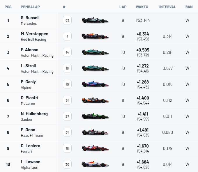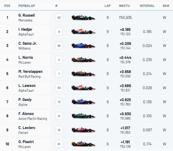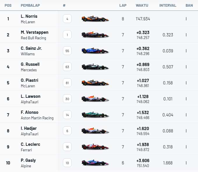 ![]() Lando Norris rebut pole position F1 GP Las Vegas, Jumat (21/11/2025) dari Max Verstappen di kualifikasi basah. Sementara, Oscar Piastri turun di posisi kelima. Lando Norris berhasil mengatasi kualifikasi Grand Prix Las Vegas yang basah untuk mengamankan pole Formula 1 ketiganya secara beruntun, menyelamatkan mobilnya dari slide untuk mengalahkan Max Verstappen di posisi terdepan. Pebalap McLaren ini memulai dengan sepasang sektor yang mengesankan di lap terakhirnya, unggul hampir satu detik dari Verstappen pada penutupan sektor kedua. Verstappen sendiri baru saja mencatatkan waktu 0,04 detik di atas Carlos Sainz untuk menempati posisi terdepan. Norris kemudian memilih untuk melewati tiga tikungan di Tikungan 14-15-16 dan meluncur ke samping di bawah akselerasi, sesuatu yang menghabiskan banyak waktu tetapi pada akhirnya terbukti cukup baik untuk meraih posisi terdepan. Hal ini jelas mengejutkan Norris, yang mengira bahwa seseorang di belakangnya mungkin bisa memperbaiki posisi. Kondisi yang sangat basah menyambut awal sesi dan, meskipun 16 dari 20 pebalap mencoba untuk memulai Q1 dengan ban intermediate. Mereka dengan cepat meninggalkannya karena sirkuit yang sangat basah dan cengkeraman yang sangat minim saat hujan terus turun. Para pebalap akhirnya kembali menggunakan ban intermediate pada Q3, karena sirkuit perlahan-lahan mengering seiring berjalannya kualifikasi. Tetapi, sirkuit tetap berbahaya meskipun sudah terbentuk garis pengeringan. Verstappen dan Sainz unggul setengah detik dari George Russell, yang tidak dapat mengulangi upaya meraih pole dari musim lalu dan akhirnya lolos ke posisi keempat. Namun, Sainz harus menjawab panggilan dari stewards karena diduga masuk kembali ke sirkuit secara tidak aman di depan Lance Stroll di Q1. ![]() Lando Norris, McLaren Oscar Piastri tidak dapat mengejar rekan setimnya dan pesaing utama Norris di lap terakhirnya setelah mengikuti Charles Leclerc yang melebar di Tikungan 12, dan memimpin barisan ketiga saat Liam Lawson yang mengendarai mobil Racing Bulls di urutan keenam. Fernando Alonso tertinggal 0,4 detik di belakangnya, dan sepersepuluh detik di depan Isack Hadjar, yang, meskipun menunjukkan kecepatan yang mengesankan sepanjang sesi, tidak dapat membanggakan diri di depan Lawson. Seperti Piastri, Leclerc tidak dapat meningkatkan upaya terakhirnya di Turn 12 dan hanya berhasil mencapai posisi kesembilan, saat Pierre Gasly melengkapi 10 besar. Nico Hulkenberg harus tersingkir dari kualifikasi di saat-saat terakhir Q2 oleh Gasly, yang menjadi yang terakhir mencatatkan waktu untuk masuk ke posisi 10 besar. Ia bergabung dengan Stroll di baris keenam dari grid, yang pertaruhannya dengan ban tengah tidak membuahkan hasil. Pebalap Kanada itu menunjukkan kecepatan yang kuat sepanjang sesi, tetapi pergantian ban setelah pertengahan sesi tidak memberikan hasil lebih lanjut karena sirkuit terbukti lambat mengering di tengah temperatur lintasan yang rendah. Kedua pebalap Haas tersingkir di Q2, karena Ollie Bearman nyaris saja lolos dari eliminasi di Q1 setelah melakukan aquaplaning ke dinding Tikungan 14. Putaran terbaik Franco Colapinto terhalang oleh sebuah slide yang mengerikan di Tikungan 15, yang berhasil diselamatkan oleh pebalap Argentina itu - tetapi ia tidak dapat mencegah dirinya menyelesaikan sesi di urutan ke-15. ![]() George Russell, Mercedes Dalam Q1 yang diwarnai dengan jarak pandang yang buruk, Alex Albon menabrak dinding di pintu keluar Tikungan 16 dan memadamkan harapannya untuk masuk ke Q2, setelah baru saja mencatatkan sektor pertama yang berwarna ungu dan sektor tengah yang kompetitif. Pebalap asal Inggris-Thailand ini terjatuh pada rintangan pertama, diikuti oleh Andrea Kimi Antonelli yang tidak dapat menemukan peningkatan yang cukup dalam upaya terakhirnya. Bortoleto dan Yuki Tsunoda juga tersingkir dari perhitungan dalam tahap pembukaan kualifikasi yang rumit, saat Lewis Hamilton menopang urutan setelah tampaknya menabrak tonggak di Tikungan 14. Hasil Q3 F1 GP Las Vegas : ![]() Hasil Q2 F1 GP Las Vegas : ![]() Hasil Q1 F1 GP Las Vegas : ![]() Sumber : id.motorsport.com