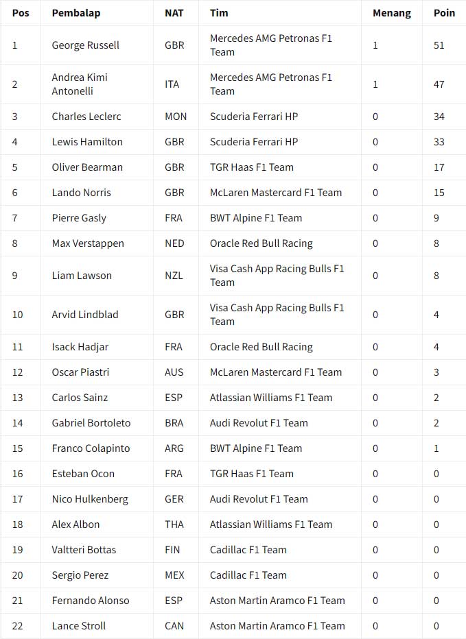 Klasemen F1 2026 Setelah Grand Prix China Di Shanghai