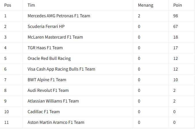 ![]() Pembaruan klasemen F1 2026 setelah putaran Grand Prix China di Shanghai. George Russell tetap kokoh di puncak klasemen F1 2026 setelah finis kedua di Grand Prix China, tapi kemenangan perdana rekan setimnya, Kimi Antonelli, membuat keunggulannya menyusut. Mercedes melanjutkan dominasi awal musimnya dengan Antonelli memimpin 1-2 untuk tim pada hari Minggu, setelah sehari sebelumnya Russell menang di Sprint Race. Ferrari kembali menjadi penantang utama Silver Arrows, dengan Lewis Hamilton mencatatkan podium pertamanya untuk tim tersebut, lebih dari setahun setelah bergabung dari Mercedes. Kegagalan memulai balapan dengan kedua mobil membuat McLaren tertinggal jauh di belakang dua tim teratas. Terjebak di 18 poin - 15 dari Lando Norris dan 3 dari Oscar Piastri - McLaren sudah tertinggal 70 poin dari Mercedes. Penampilan gemilang Ollie Bearman yang terus berlanjut memberikan dampak besar bagi timnya dalam persaingan klasemen konstruktor. Performa konsisten yang ia tampilkan pada balapan terbaru membantu timnya meraih hasil penting, sekaligus memperlihatkan kontribusi signifikan dari pebalap muda tersebut sepanjang akhir pekan balapan. Berkat hasil tersebut, Haas F1 Team berhasil melompati Red Bull Racing dalam perebutan posisi di klasemen konstruktor. Pencapaian ini menjadi perkembangan menarik dalam persaingan tim, terutama karena kedua tim tersebut saling berusaha mengumpulkan poin penting sejak awal musim. Situasi tersebut turut dipengaruhi oleh hasil yang kurang menguntungkan bagi Red Bull dalam balapan tersebut. Pebalap andalan mereka, Max Verstappen, tidak dapat menyelesaikan lomba setelah terpaksa mundur dari balapan, sehingga tim kehilangan kesempatan untuk menambah poin pada kesempatan tersebut. Selain itu, rekan satu timnya di Red Bull, Isack Hadjar, juga mengalami insiden sejak awal balapan. Kecelakaan yang terjadi pada fase awal lomba membuat pebalap asal Prancis tersebut berada dalam posisi yang kurang menguntungkan untuk bisa bersaing memperebutkan hasil yang lebih baik. Rangkaian kejadian tersebut pada akhirnya memberi keuntungan tersendiri bagi Haas dalam perebutan poin konstruktor. Dengan performa solid yang ditunjukkan Bearman, tim tersebut mampu memanfaatkan situasi yang dialami rivalnya untuk memperbaiki posisi mereka dalam klasemen sementara. Setelah dua akhir pekan balapan berlangsung, persaingan di papan tengah klasemen konstruktor mulai menunjukkan dinamika yang menarik. Sejumlah tim berhasil mengamankan poin penting sejak awal musim, sehingga membuat posisi klasemen sementara terus mengalami perubahan dari satu balapan ke balapan berikutnya. Di tengah perkembangan tersebut, hanya dua tim yang hingga kini masih belum berhasil meraih poin. Kedua tim tersebut adalah Cadillac Formula One Team dan Aston Martin F1 Team, yang setelah dua akhir pekan balapan masih berusaha membuka perolehan poin mereka musim ini. Klasemen Pebalap F1 2026 Usai GP China : ![]() Klasemen Konstruktor F1 2026 Usai GP China : ![]() Sumber : crash.net