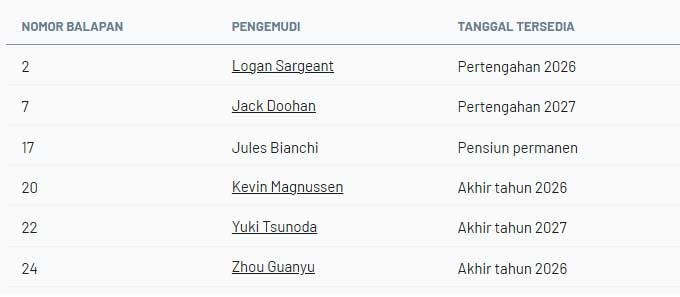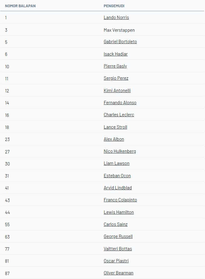 ![]() Para pebalap Formula 1 memiliki nomor balap tetap yang mereka gunakan sepanjang karier mereka. Berikut adalah siapa yang berlomba dengan nomor berapa, dan kisah di balik setiap pilihan tersebut. Setiap pebalap Formula 1 berlomba dengan nomor tetap. Seri ini memperkenalkan konsep nomor permanen pada tahun 2014 untuk membuat pebalap lebih mudah dikenali oleh penggemar di lintasan, karena sebelumnya nomor diberikan berdasarkan klasemen akhir kejuaraan dunia. Selama bertahun-tahun, hanya juara dunia yang diizinkan untuk mengubah nomor balap mereka: mereka diberi pilihan untuk menukar nomor permanen mereka dengan nomor ikonik #1. Semua pebalap lain harus tetap menggunakan nomor yang awalnya mereka pilih. Namun, menyusul perubahan aturan baru-baru ini, pebalap lain sekarang juga dapat mengajukan permintaan untuk mengubah nomor mereka – sesuatu yang telah dimanfaatkan oleh Max Verstappen . Bagi banyak pebalap, ada cerita menarik di balik nomor balap yang mereka pilih. Mungkin itu nomor keberuntungan mereka, atau mungkin menyimpan kenangan istimewa. Dalam artikel ini, kita akan membahas semua nomor balap untuk musim Formula 1 2026 dan penjelasan di baliknya. Nomor balap pebalap Formula 1 tahun 2026 : ![]() Lando Norris ![]() Nomor balapan: 1 Tim: McLaren Sebagai juara dunia bertahan, Lando Norris berhak memilih untuk balapan dengan nomor 1. Setelah meraih gelar juara dunia pertamanya di Abu Dhabi 2025, itulah yang ia putuskan. Oleh karena itu, pebalap Inggris ini menukar nomor 4 yang biasa ia gunakan dengan nomor 1, yang ia ambil alih dari Max Verstappen setelah empat tahun. Itu adalah pilihan yang logis bagi Norris. “Nomor itu ada karena suatu alasan: Anda harus berjuang untuk mendapatkannya, bekerja keras untuk meraihnya. Semua orang di McLaren – mekanik saya, insinyur saya, semua orang yang merupakan bagian dari tim – juga dapat mengenakan nomor itu dengan bangga,” jelasnya kepada Sky Sports pada akhir tahun 2025. Max Verstappen ![]() Nomor balapan: 3 Tim: Red Bull Max Verstappen harus melepaskan nomor 1 pada akhir tahun 2025. Kembali ke nomor 33 tampaknya menjadi pilihan yang jelas, tetapi pada tahun 2026 juara dunia empat kali itu malah menggunakan nomor 3 di Red Bull RB22-nya. Dia mengambil alih nomor tersebut dari Daniel Ricciardo , yang meninggalkan Formula 1 pada pertengahan tahun 2024. Hingga tahun 2025, para pebalap diharuskan menggunakan nomor balap yang sama sepanjang karier mereka. Verstappen dapat beralih ke nomor 3 karena perubahan peraturan. Para pebalap sekarang dapat mengajukan permintaan dan, jika disetujui, mereka diizinkan untuk mengubahnya. Verstappen juga mendapat persetujuan dari Ricciardo, karena secara teknis pebalap Australia itu mempertahankan hak atas nomor tersebut hingga pertengahan tahun 2026. Tidak terlalu mengejutkan bahwa Verstappen beralih ke nomor 3. Itu adalah nomor keberuntungannya ketika masih muda, dan karena alasan itu ia selalu ingin menggunakannya di Formula 1, tetapi Ricciardo sudah memilikinya. “Nomor 33 selalu bagus, tetapi saya hanya berpikir satu angka 3 terlihat lebih baik daripada dua angka 3,” jelasnya kepada Viaplay pada akhir tahun 2025. “Tentu saja saya selalu mengatakan itu melambangkan keberuntungan ganda, tetapi saya sudah mendapatkan keberuntungan saya di Formula 1.” Gabriel Bortoleto ![]() Nomor balap: 5 Tim: Audi Gabriel Bortoleto memilih nomor 5 untuk debutnya pada tahun 2025. Nomor ini telah digunakan selama bertahun-tahun oleh mantan juara dunia Sebastian Vettel . Alasan Bortoleto memilih nomor 5 sangat sederhana: ia memenangkan kejuaraan FIA Formula 3 pada tahun 2023 dengan nomor yang sama. Isack Hadjar ![]() Nomor balapan: 6 Tim: Red Bull Pebalap Red Bull, Isack Hadjar, berlomba dengan nomor #6. Ia sering menggunakan nomor tersebut di masa lalu dan karena itu memiliki kenangan yang baik dengannya. Ia sudah berlomba dengan nomor #6 sejak awal kariernya di karting, dan promosinya ke F1 berarti ini adalah pertama kalinya dalam sejarah sebuah nomor balap digunakan oleh tiga pebalap berbeda, setelah Nico Rosberg dan Nicholas Latifi sebelumnya juga pernah menggunakannya. Pierre Gasly ![]() Nomor lomba: 10 Tim: Alpine Pebalap Alpine, Pierre Gasly, menggunakan nomor balap tetap 10. Dengan nomor tersebut, pebalap Prancis ini memenangkan gelar Formula Renault 2.0 Eurocup pada tahun 2013. Ia juga merupakan penggemar berat pesepakbola Zinedine Zidane, yang mengenakan nomor 10 untuk timnas Prancis. Sergio Perez ![]() Nomor balap: 11 Tim: Cadillac Sergio Perez kembali ke Formula 1 pada tahun 2026 dengan nomor punggung 11 yang biasa ia gunakan. Pebalap Cadillac ini telah menggunakan nomor 11 sejak 2014 dan juga pernah menggunakannya di ajang karting. Motivasi di balik pilihan tersebut adalah karena Perez merupakan penggemar berat pesepakbola Ivan Zamorano, yang mengenakan nomor punggung 11 untuk klub Meksiko CF America selama satu musim. Kimi Antonelli ![]() Nomor balap: 12 Tim: Mercedes Pebalap andalan Mercedes, Kimi Antonelli, melakukan debut Formula 1-nya dengan nomor 12. “Ada beberapa nomor yang bagus, tetapi 12 adalah nomor yang istimewa. Itu karena seorang idola. Saya juga pernah balapan dengan nomor itu sejak F4. Nomor 12 selalu cocok, jadi saya tidak melihat alasan untuk mengubahnya.” Idola yang dimaksud adalah Ayrton Senna, legenda Brasil yang menggunakan nomor 12 antara tahun 1985 dan musim 1988 yang membawanya meraih gelar juara. Fernando Alonso ![]() Nomor balap: 14 Tim: Aston Martin Pebalap Aston Martin, Fernando Alonso, menggunakan nomor 14, yang berasal dari sebuah peristiwa di masa lalu. Pada 14 Juli 1996, di usia 14 tahun, ia menjadi juara dunia karting dengan kart bernomor 14. “Sejak saat itu, saya tahu #14 adalah nomor saya,” ujarnya sebelumnya. Charles Leclerc ![]() Nomor balap: 16 Tim: Ferrari Charles Leclerc berlomba di Formula 1 dengan nomor permanen 16. Pebalap Ferrari ini lahir pada 16 Oktober 1997. Pilihan pertamanya adalah nomor keberuntungan 7, tetapi nomor itu sudah dipakai oleh Kimi 