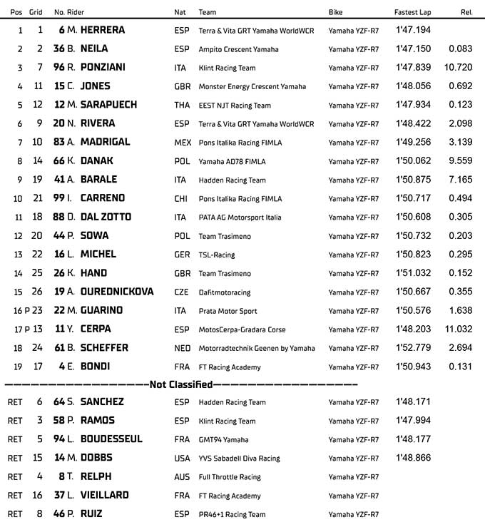 Maria Herrera (Terra & Vita GRT Yamaha WorldWCR) memimpin klasemen Kejuaraan dengan meraih kemenangan keduanya musim ini, di depan Beatriz Neila (Ampito Crescent Yamaha) di posisi kedua dan Roberta Ponziani (Klint Racing Team) di posisi ketiga.