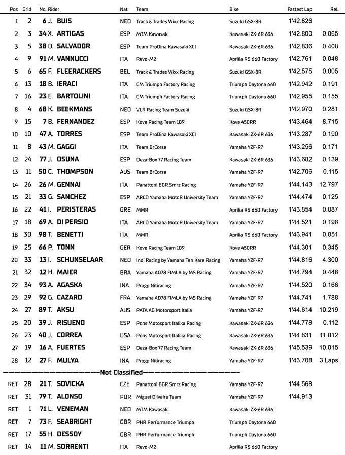 Harapan para pebalap Belanda di barisan depan bertumpu pada Jeffrey Buis (Track & Trades Wixx Racing), yang memimpin di awal balapan 12 lap, memimpin Suzuki meraih posisi 1-2 bersama rekan setimnya Ferre Fleerackers. Pada Lap 4, Fleerackers menggeser mobil #6 ke posisi kedua saat memasuki Chicane Geert Timmer, meskipun Buis berhasil menyalip satu lap kemudian. Urutan posisi terus berubah sepanjang balapan, tetapi Buis mampu mempertahankan posisinya untuk meraih kemenangan bagi Suzuki; kemenangan pertama mereka di paddock sejak Eugene Laverty pada tahun 2014 di Race 1 di Phillip Island di WorldSBK. Xavi Artigas (MTM Kawasaki) berhasil meraih posisi kedua, sementara David Salvador (Team ProDina Kawasaki XCI) melengkapi podium. VANNUCCI GAGAL MERAIH PODIUM Matteo Vannucci (Revo-M2) sempat bersaing memperebutkan podium di tahap akhir balapan tetapi turun ke posisi keempat pada lap terakhir, sementara Fleerackers finis di luar podium meskipun sempat berada di posisi pertama dan kedua, dengan pebalap Belgia itu akhirnya finis di posisi kelima. Bruno Ieraci (CM Triumph Factory Racing) memastikan perwakilan Triumph di enam besar dengan finis di posisi keenam, mengalahkan rekan setimnya Elia Bartolini hanya dengan selisih 0,155 detik. BEEKMANS DI POSISI KE-8: Hasil yang bagus untuk pebalap Belanda, Fernandez mencetak poin untuk Kove Pebalap Belanda Kas Beekmans (VLR Racing Team Suzuki) finis di posisi kedelapan setelah start yang kuat, di depan Juara Dunia SSP300 2025 Benat Fernandez (Kove Racing Team 109) yang meraih poin pertama Kove musim ini; tujuh pabrikan yang berkompetisi di WorldSPB musim ini kini telah mengumpulkan poin. Antonio Torres (Team ProDina Kawasaki XCI) memasuki Race 1 sebagai pemimpin klasemen Kejuaraan tetapi hanya mampu finis di posisi ke-10. CATATAN PENTING: Dari Balapan 1 Pada Lap 1 di Tikungan 10, Mattia Sorrenti (Revo-M2), Harrison Dessoy (PHR Performance Triumph) dan Alvaro Fuertes (Deza-Box 77 Racing Team) terlibat dalam kecelakaan yang memaksa Sorrenti dan Dessoy keluar dari balapan, sementara Fuertes mampu melanjutkan. Pada Lap 8, Tomas Alonso (Miguel Oliveira Team) mengalami kecelakaan di Tikungan 5. Troy Sovicka (Panattoni BGR Smrz Racing) tersingkir dari persaingan ketika ia mengalami masalah teknis pada Lap 9. Hasil Race 1 WorldSPB Belanda 2026 : ![]() Sumber : worldsbk.com