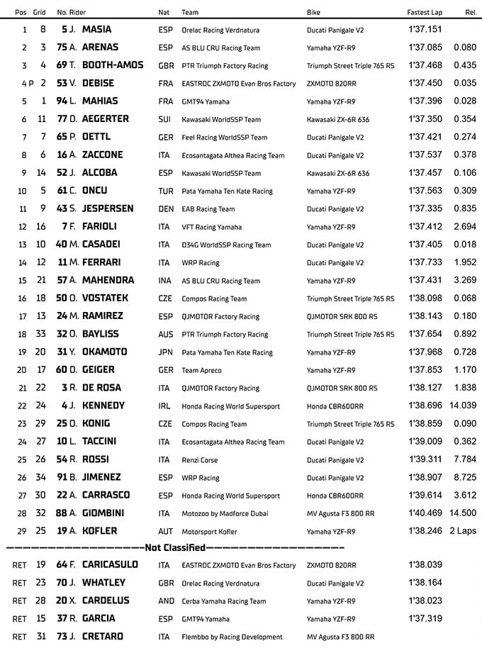 Jaume Masia (Orelac Racing VerdNatura) berhasil meraih poin terbanyak di Race 1, melakukan comeback luar biasa di akhir balapan untuk memenangkan perlombaan, finis di depan Albert Arenas (AS BLU CRU Racing Team) yang meraih podium ketiganya, satu langkah di atas Tom Booth-Amos (PTR Triumph Factory Racing) yang keluar dari Race 1 yang penuh naik turun di posisi ketiga di podium.