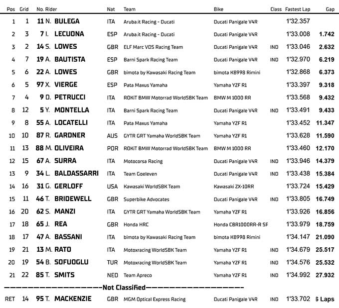 PEREBUTAN POSISI: Bautista mengalahkan Alex Lowes, pertarungan sengit sepanjang balapan untuk posisi ke-6 Alex Lowes (bimota by Kawasaki Racing Team) tampil agresif di awal balapan, menyalip Alvaro Bautista (Barni Spark Racing Team) di Tikungan 16 dan Xavi Vierge (Pata Maxus Yamaha) di Tikungan 1 pada lap berturut-turut untuk naik ke posisi ke-4. Pebalap bernomor #22 awalnya unggul jauh dari pebalap bernomor #19, tetapi Bautista mampu memperkecil jarak dan mencoba menyalip Alex Lowes pada Lap 8 di Tikungan 16. Namun, pebalap Inggris itu bertahan dengan baik, meskipun pebalap Spanyol itu berhasil menyalip di Tikungan 1 pada Lap 9. Hal itu memungkinkan Bautista untuk finis di posisi ke-4 dengan Alex Lowes di posisi ke-5. Perebutan posisi ke-6 berlangsung sengit dan Xavi Vierge (Pata Maxus Yamaha) berhasil merebutnya di lap terakhir untuk mengamankan posisi start baris kedua. MENGAMANKAN FINISH SEMBILAN TERATAS: Petrucci gagal meraih posisi ke-6 di lap terakhir Danilo Petrucci (ROKiT BMW Motorrad WorldSBK Team) finis di urutan ketujuh setelah kalah dari Vierge di lap terakhir, sementara Yari Montella (Barni Spark Racing Team) berjuang kembali ke posisi kedelapan; ia finis 0,001 detik di belakang ‘Petrux‘ di garis finis. Baris ketiga di Race 2 akan dilengkapi oleh Andrea Locatelli (Pata Maxus Yamaha). Setelah start yang kuat, ‘Loka‘ berada di lima besar pada tahap awal, sebelum turun peringkat. Ia harus menyerahkan satu posisi saat berada di P9 karena gaya berkendara yang tidak bertanggung jawab, membiarkan Remy Gardner (GYTR GRT Yamaha WorldSBK Team) melewatinya di Tikungan 5 pada Lap 10, tetapi pebalap #55 itu merebut kembali P9 di lap terakhir. Hasil Superpole Race WorldSBK Belanda 2026 : ![]() Sumber : worldsbk.com