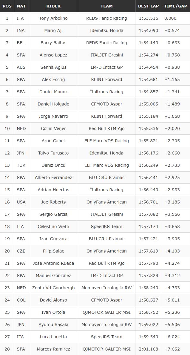 Rider asal Italia itu diikuti pebalap asal Indonesia dari tim Idemitsu Honda, Mario Aji, di posisi kedua dengan lap time 1:54.090, dan pebalap REDS Fantic Racing, Barry Baltus, di posisi ketiga dengan lap time 1:54.149.