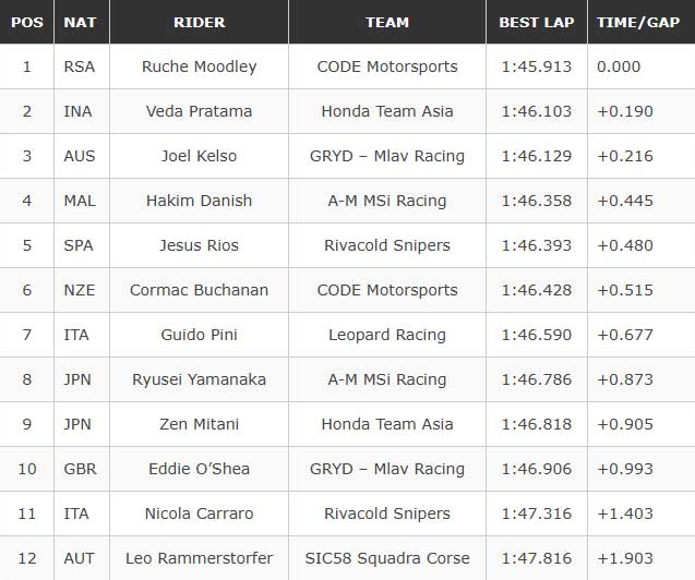 Di posisi ketiga ditempati oleh Joel Kelso (GRYD – Mlav Racing) dengan catatan waktunya di 1 menit 46.129 detik. Dan melengkapi 4 pebalap yang bisa mengikuti sesi selanjutnya (Q2) adalah, Hakim Danish dari A-M MSi Racing dengan membukukan waktu 1 menit 46.358 detik.