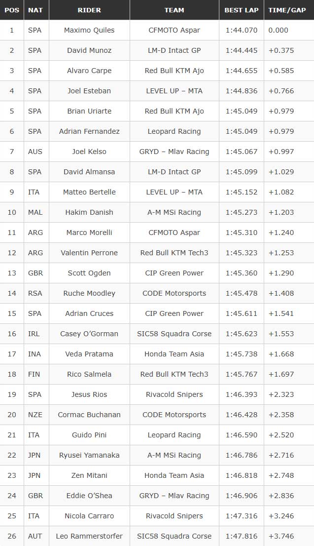 Dibaris kedua (second row) ada pebalap: Joel Esteban (LEVEL UP – MTA), Brian Uriarte (Red Bull KTM Ajo), dan Adrian Fernandez (Leopard Racing) dengan gap masing-masing +0.766 detik, +0.979 detik, dan +0.979 detik. Dibaris ketiga (third row) ada: Joel Kelso (GRYD – Mlav Racing), David Almansa (LM-D Intact GP), Matteo Bertelle (LEVEL UP – MTA) dengan masing -masing jaraknya +0.997 detik, +1.029 detik dan +1.082 detik.