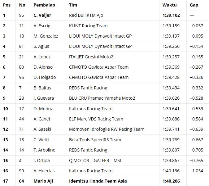 Sementara itu, perhatian juga tertuju pada pebalap Indonesia yang membela Idemitsu Honda Team Asia, yaitu Mario Aji. Ia harus puas berada di posisi ke-17 pada sesi kali ini, setelah menghadapi sejumlah tantangan yang cukup berat sepanjang jalannya sesi tersebut.