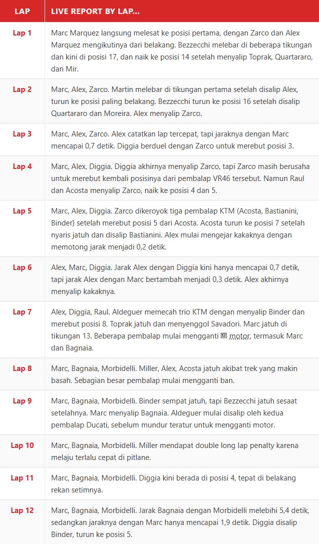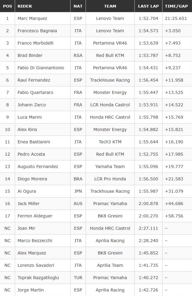 Keseluruhan jalannya balapan memperlihatkan bagaimana Luca Marini dan Alex Rins sama-sama berjuang keras untuk mengamankan posisi mereka masing-masing. Marini bertahan di posisi kesembilan dengan selisih +15.769 detik, sementara Rins menutup posisi sepuluh besar, menunjukkan ketatnya kompetisi di antara para pebalap.