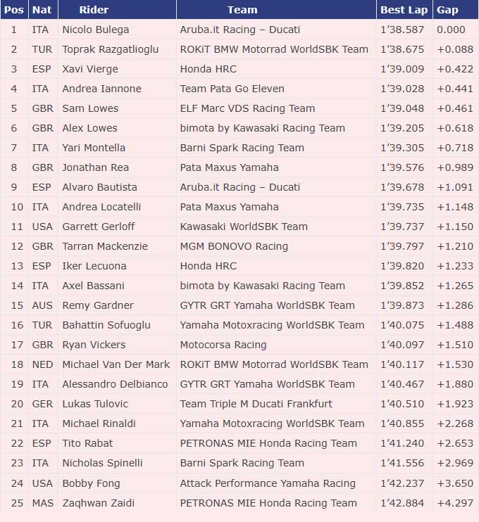 Diposisi kedua ada Toprak Razgatlioglu dari ROKiT BMW Motorrad WorldSBK Team dengan catatan waktu 1’38.675 atau selisih +0.088. Menutup posisi tiga besar ada Xavi Vierge yang mengendarai motor Honda CBR1000 RR-R-nya dengan waktu 1’39.009 atau lebih lambat +0.422….