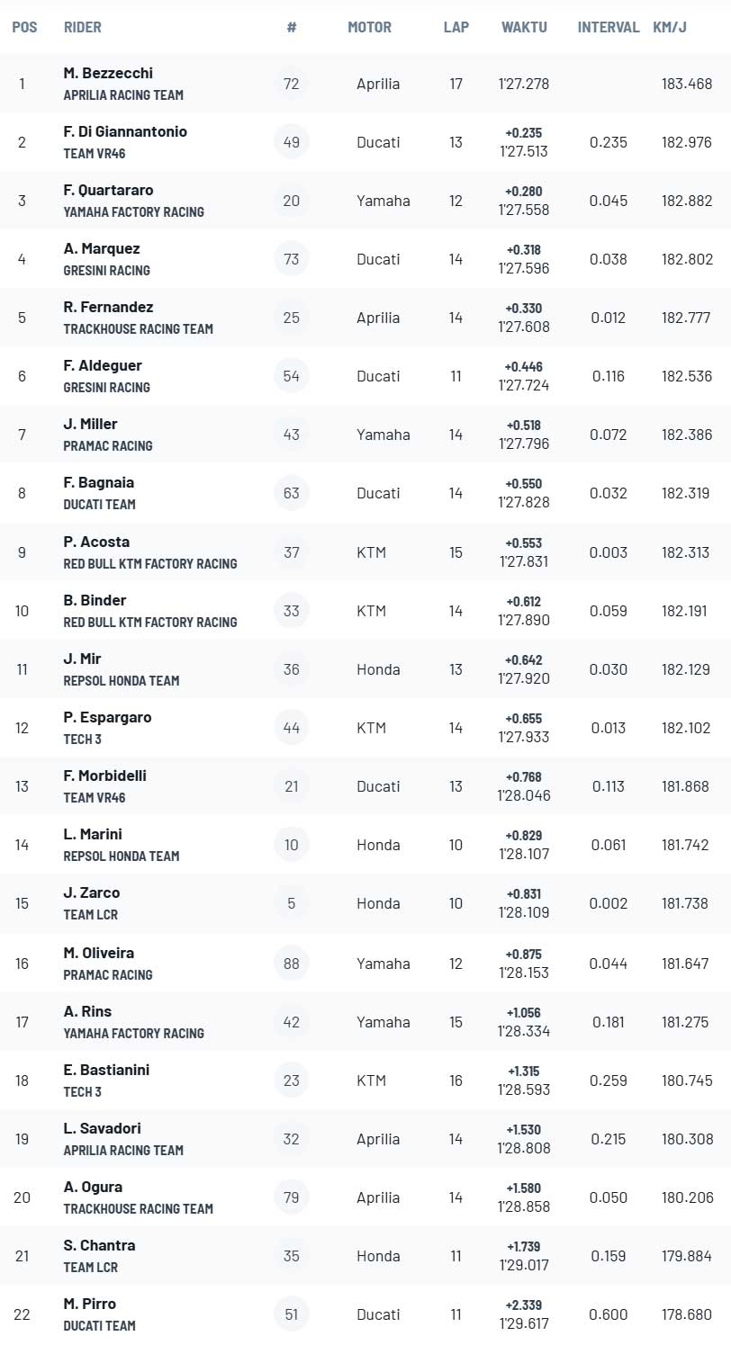 Brad Binder melengkapi posisi sepuluh besar setelah menghabiskan sebagian besar sesi mengikuti Pedro Acosta untuk mengumpulkan data performa KTM. Di sisi lain, Luca Marini dari Honda Racing mengalami masalah teknis serius saat motornya mengeluarkan asap di tengah sesi. Insiden itu membuatnya kehilangan waktu dan harus puas finis di posisi ke-14 setelah sesi selesai.