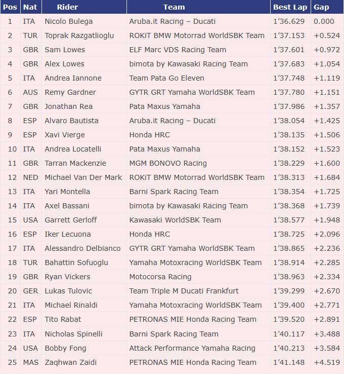 Sayangnya, upaya pebalap Turki itu melewati catatan waktu Bulega gagal. Setelah melewati beberapa sektor dengan cepat, capaian Razgatlioglu mentok di 1:37,153. Itu cukup untuk mengerek posisinya satu tangga. Di menit terakhir, rider Italia pun menjauh hingga 0,5 detik dan meningkatkan rekornya menjadi 1:36,629.