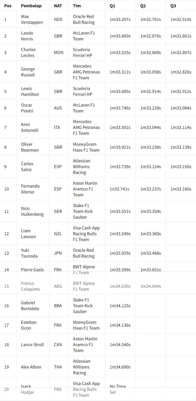Satu-satunya putaran Q3 Verstappen yang mencatatkan 1:32,510 sudah cukup untuk memastikan pole grand prix ketujuhnya musim 2025, sementara pemimpin klasemen sementara McLaren, Oscar Piastri, hanya mampu menempati posisi keenam.