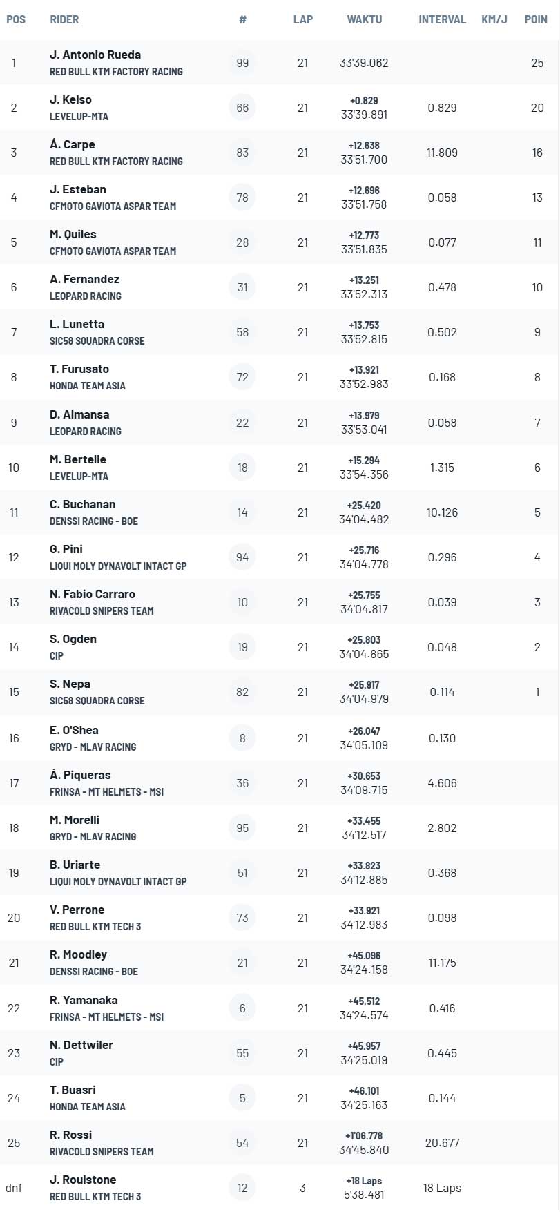 Sisa dari perolehan poin dilengkapi oleh Adrian Fernandez, Luca Lunetta, Taiyo Furusato, David Almansa, Matteo Bertelle, Cormac Buchanan, Guido Pini, Nicola Carraro, Scott Ogden, dan Stefano Nepa. Angel Piqueras finis di urutan ke-17, di belakang Eddie O‘Shea.