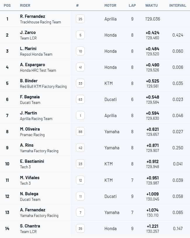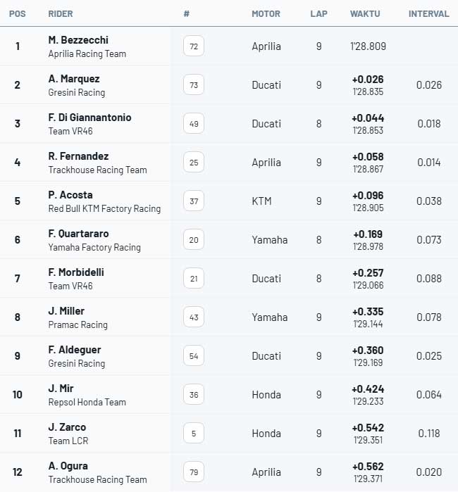 ![]() Marco Bezzecchi tidak melewatkan kesempatan ini dan membuktikan bahwa ia adalah pebalap yang sedang dalam performa terbaiknya saat ini, dengan meraih pole position terakhir musim ini di MotoGP Valencia, Sabtu (15/11/2025). Itu pole position kelimanya di tahun ini, dan mengalahkan rekor dengan 1:28,809. Pebalap Aprilia ini sempat mengalami kesulitan pada percobaan pertamanya, di mana ia terseret oleh motor di depannya dan hampir kehilangan kendali, keluar dari lintasan. Namun, Marco Bezzecchi berada dalam momen yang manis, dalam kondisi prima dan sangat memahami motornya. Dengan ban kedua, pebalap Remini itu menyelesaikan satu lap dalam 1:28,809 yang cukup untuk memecahkan rekor Cheste, mengalahkan 1:28,931 yang dibuat Maverick Vinales, yang saat itu juga di Aprilia, untuk meraih pole position pada 2023. Oleh karena itu, pebalap Italia itu akan memulai dari grid pertama, untuk mengincar kemenangan ketiganya tahun ini dan memastikan peringkat ketiganya di klasemen keseluruhan. Di urutan kedua adalah runner-up Alex Marquez, yang mencatat waktu 1:28,835, hanya terpaut 0,026 detik dari posisi terdepan, di depan Fabio Di Giannantonio yang akan kembali start dari baris terdepan pada balapan terakhir tahun ini. Raul Fernandez, yang datang dari Q1 dan mampu mencatatkan waktu tercepat untuk mengalahkan Pedro Acosta, salah satu favorit akhir pekan ini, harus puas memulai balapan dari baris kedua. Posisi yang membuat targetnya untuk memenangkan balapan menjadi lebih sulit. Baris kedua juga akan diisi oleh Fabio Quartararo, seorang spesialis dry lap yang kali ini tidak dapat melakukan hal yang sama dengan Yamaha. Franco Morbidelli akan start dari baris ketiga, ditemani oleh Jack Miller dan FermÃn Aldeguer, yang harus memulai dari belakang sekali lagi jika ingin menantang posisi terdepan. Honda milik Joan Mir dan Johann Zarco, bersama dengan Ai Ogura dari Jepang, akan melengkapi baris keempat. Bagnaia terjatuh di Q1 Dari Q1, Raul Fernandez melaju ke Q2, dengan catatan waktu terbaik di akhir pekan sejauh ini (1:29,036) dan Johann Zarco, sementara Luca Marini, yang naik ke posisi ketiga di lap terakhirnya, dan pemain wildcard Aleix Espargaro naik ke posisi kedua sebelum disalip oleh pebalap Prancis itu, dan Brad Binder berada di urutan kelima. Sekali lagi, masalah membuat Pecco Bagnaia dan Ducatinya terdampar. Pebalap Italia itu mencatatkan putaran cepat dan tetap berada di urutan pertama dan kedua, hingga, dengan tiga menit tersisa, saat dia mencatat waktu tercepat di sektor pertama. Motornya berhenti merespons gas, tampaknya karena kekurangan bahan bakar, yang memaksanya keluar dari lintasan, membuatnya turun ke posisi keenam, sehingga dia akan memulai dari urutan ke-16 di grid. Tepat di belakangnya adalah saingan beratnya akhir-akhir ini, Jorge Martin, yang akan memulai balapan dari P17, dengan Maverick Vinales, pebalap lain yang kembali beraksi setelah mengalami cedera, akan memulai balapan dari posisi ke-21. Hasil Q2 MotoGP Valencia : ![]() Hasil Q1 MotoGP Valencia : ![]() Sumber : id.motorsport.com