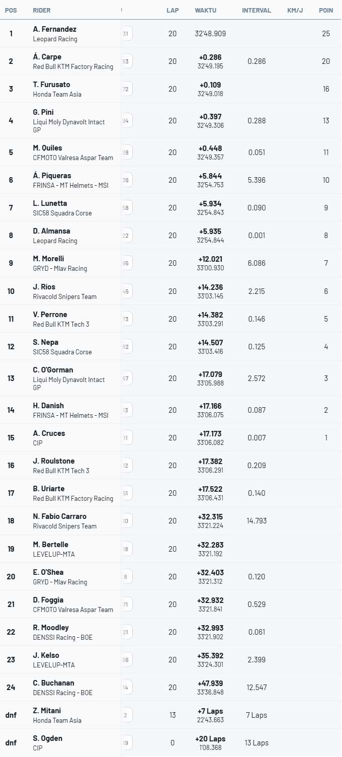 ![]() Adrian Fernandez tetap tenang sepanjang waktu dan meraih kemenangan perdananya di Moto3 melawan Alvaro Carpe dan Taiyo Furusato. Pebalap Leopard Racing telah meraih kemenangan pertamanya di Moto3. Pebalap Spanyol itu menyelesaikan penampilan yang luar biasa di Grand Prix Valencia, di Sirkuit Riccardo Tormo, Minggu (16/11/2025), memimpin hampir sepanjang waktu dan tanpa melakukan kesalahan untuk menghindari serangan. Ia mengalahkan Taiyo Furusato (turun ke posisi ketiga karena melanggar track limit) dan Alvaro Carpe. Maximo Quiles mencoba mengejarnya beberapa kali, tetapi pada lap terakhir yang buruk dia finis kelima, kehilangan kesempatan untuk menjadi runner-up di kejuaraan dunia. Posisi itu jatuh ke tangan Angel Piqueras, yang berada di urutan keenam. Balapan terakhir tahun ini di kategori kecil diadakan dalam kondisi dingin di Sirkuit Ricardo Tormo, dengan suhu kurang dari 20 ºC baik di atmosfer maupun di aspal, tetapi matahari mulai menyinari beberapa bagian lintasan, seperti lintasan lurus. Di awal, Adrian Fernandez berusaha mempertahankan posisi terdepan, namun Maximo Quiles mencurinya di Tikungan 1. Namun, di tikungan berikutnya, Fernandez dan David Almansa kembali memimpin atas Quiles, Alvaro Carpe, dan Luca Lunetta. Di belakang, Scott Ogden mengalami kecelakaan pertama, di Tikungan 9. Sebelum lap pertama selesai, Almansa naik ke posisi terdepan, untuk mencoba memaksakan kecepatan terbaiknya, yang telah ia tunjukkan selama latihan akhir pekan ini. Namun sebelum lap ketiga, rekan setimnya di Leopard Racing, Fernandez, menyalipnya di tikungan sebelum lintasan lurus, hampir menyentuhnya, memaksa pebalap Spanyol itu melebar dan turun ke P8. Dengan demikian, pebalap Spanyol itu tetap berada di depan, di depan Quiles, Carpe, Lunetta, Marco Morelli, dan Taiyo Furusato. Di belakang, Almansa mulai mendorong untuk memulihkan posisi, mencatat lap tercepat di bawah 1:38, dan pada lap 5, ia sudah berada di urutan keempat, menguntit para pebalap podium, yang tidak banyak berubah, kecuali pertukaran posisi antara Quiles dan Lunetta ketika sepertiga pertama balapan selesai. Di sana, pergerakan dimulai, dan pada lap 8, Almansa yang memimpin dengan slipstream turun ke posisi ketujuh, karena tabrakan di lap pertama. Pada pertengahan balapan, Fernandez dan Quiles memegang kendali, meskipun Furusato mulai menekan mereka. Namun situasi kembali stabil di lap-lap berikutnya, hingga sebelum dimulainya lap 13 dari 20 lap yang dijadwalkan, ketika Quiles tergelincir di tikungan terakhir dan membiarkan pebalap Jepang itu melewatinya. Dengan 6 lap tersisa, Fernandez, Furusato dan Quiles mendapatkan jarak sepersepuluh detik dari Carpe, Guido Pini dan Lunetta, yang meninggalkan Almansa dan Angel Piqueras. Pada titik ini, anak didik Marquez bersaudara menyerang untuk kembali ke posisi kedua dan bersiap menghadapi akhir balapan. Namun di lap terakhir, pebalap Asia itu mengembalikannya, sementara tidak ada yang mampu membuat sang pemimpin dalam kesulitan. Quiles kembali naik ke posisi kedua di lap terakhir, tetapi Furusato berhasil merebutnya kembali, sementara Carpe dan Pini terjebak di belakangnya. Sementara itu, Fernandez tidak diganggu dan berhasil memimpin di lap terakhir, di depan rider CFMoto Aspar Team, yang kembali menyalip pebalap Honda Team Asia itu. Furusato kembali menyerangnya di tikungan pertama, dan pebalap Spanyol itu berhasil mempertahankan posisi nomornya. Adrian Fernandez yang tampil sempurna, yang tidak pernah melakukan kesalahan, terus melaju menuju kemenangan pertamanya di Kejuaraan Dunia. Di belakang, Carpe mampu melewati Quiles, tetapi murid Aspar itu mampu mengembalikannya. Namun di tikungan terakhir, ia tak mampu mempertahankannya, dan disalip Carpe dan Pini. Furusato berada di urutan kedua, namun menyentuh garis hijau di lap terakhir, yang membuatnya turun ke posisi ketiga di belakang Carpe. Dengan posisi kelima yang diraihnya, Quiles harus puas menempati posisi ketiga di Kejuaraan Dunia Pebalap, sementara Angel Piqueras, yang berada di posisi keenam, menjadi runner-up Kejuaraan Dunia. Zona poin dilengkapi oleh David Almansa, Jesus RÃos, ValentÃn Perrone, Stefano Nepa, Marco Morelli, setelah Long Lap Penalty, Casey O‘Gorman, Hakim Danish dan Adrian Cruces. Hasil Race Moto3 Valencia : ![]() Sumber : id.motorsport.com