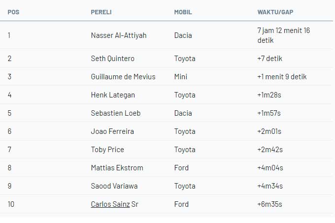 ![]() Toyota tampil dominan di Etape 2 Dakar, sementara Ford dan Mini gagal menembus 10 besar. Seth Quintero memimpin posisi lima besar untuk Toyota di etape kedua Reli Dakar 2026, sementara Nasser Al-Attiyah dari Dacia melesat ke posisi teratas dalam klasemen keseluruhan. Sempat kesulitan di awal edisi ke-48 Dakar di Yanbu, Toyota bangkit kembali dengan kuat pada tes 400 km, Senin (5/1/2025) ke Al-Ula, dengan mobil pick-up Hilux tampil sebagai yang terbaik di kelasnya. Baik Toyota Afrika Selatan maupun tim World Rally-Raid tetap berada di depan sepanjang hari, dengan Saood Variawa memimpin pada 100 km pertama sebelum Quintero mengambil alih posisi terdepan pada checkpoint keempat di 143 km. Variawa tetap berada dalam jarak yang cukup jauh di etape berikutnya, namun akhirnya tertinggal tujuh menit di belakang, dan memberikan Quintero keunggulan hingga finis. Pebalap Amerika Serikat ini berhasil merebut bendera finis dengan selisih waktu 1 menit 42 detik, yang merupakan kemenangan ketiga dalam kariernya di kategori Ultimate Dakar. Dengan Variawa yang tertinggal di belakang, runner-up tahun lalu, Henk Lategan, berhasil merebut posisi kedua di checkpoint kedua dari belakang, sebelum mengukuhkan posisinya di lintasan menuju garis finis. Sementara itu, juara bertahan Yazeed Al-Rajhi melakukan comeback yang kuat setelah melalui etape pembuka yang buruk di mana ia kehilangan waktu hampir 30 menit karena beberapa kesalahan dan penalt. Wakil tuan rumah berhasil membawa mobil Toyota yang dikemudikannya ke posisi ketiga. Pemenang dua kali balap motor, Toby Price, melengkapi posisi 1-2-4 untuk tim W2RC Toyota, mengalahkan Joao Ferreira di posisi terbaik Toyota Afrika Selatan. Ferreira termasuk salah satu dari beberapa pebalap yang mengalami kerusakan pada etape kedua yang sulit di Arab Saudi. ![]() #299 The Dacia Sandriders Dacia: Nasser Al-Attiyah, Fabian Lurquin Pereli non-Toyota tercepat pada Senin adalah juara WRC sembilan kali, Sebastien Loeb, yang finis di urutan keenam dengan mobil Dacia Sandrider-nya, enam menit di belakang pemenang Quintero. Loeb diikuti oleh rekan setimnya, Al-Attiyah, yang kehilangan waktu pada sepertiga bagian sebelum kembali ke posisi keenam. Tiga posisi terakhir di dalam 10 besar ditempati oleh para pereli Toyota lainnya, dengan duo ayah-anak Michal Goczal dan Eryk Goczal yang masing-masing finis P8 dan P10 untuk Energylandia. Variawa terjepit di antara keduanya setelah kehilangan kecepatan di akhir-akhir lomba. Pemenang Etape 1, Guillaume de Mevius, hanya menuntaskan lomba di urutan ke-11 dengan X-raid Mini-nya, tertinggal lebih dari delapan menit dari para pemuncak klasemen. Ford juga mengalami hari yang buruk di Dakar, dengan pemenang Prolog, Mattias Ekstrom, yang kehilangan waktu lebih dari sembilan menit untuk finis di urutan ke-12 dan legenda reli Carlos Sainz Sr yang hanya mampu menempati posisi ke-14. Di klasemen umum, Al-Attiyah memimpin klasemen setelah dua pertandingan yang solid meskipun tidak spektakuler di dekat Laut Teluk. Pebalap Qatar ini memiliki keunggulan tipis tujuh detik dari pemenang Senin, Quintero, yang sebagian besar pulih dari etape pembuka yang sulit pada Minggu di mana ia finis di urutan ke-18 setelah terkena penalti ngebut selama dua menit. De Mevius dari Mini turun ke peringkat ketiga namun hanya tertinggal 1,09 detik dari Al-Attiyah, dengan Lategan tertinggal 19 detik di peringkat keempat. Loeb membuat dua pebalap Dacia berada di posisi lima besar, diikuti oleh duo Toyota, Ferreira dan Price. Pereli Ford yang berada di posisi teratas dalam klasemen adalah Ekstrom di urutan kedelapan, terpaut 4 menit dari pemimpin klasemen, sementara Variawa dan Sainz melengkapi posisi 10 besar. Klasemen Umum Etape 2 Dakar 2026 - Mobil : ![]() Sumber : id.motorsport.com