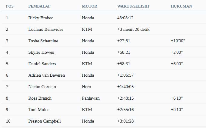 ![]() Ricky Brabec memenangi etape 12 Dakar, Jumat (16/1/2026), dan mengungguli Luciano Benavides dengan selisih 3 menit 20 detik. Selisih yang tampaknya cukup mudah untuk dikelola untuk etape penutup. Tujuan akhir Yanbu kini sudah sangat dekat, hanya berjarak 108 km, sehingga Ricky Brabec benar-benar mulai merasakan aroma kesuksesan akhir di kategori motor Dakar 2026. Pebalap Honda memasuki stage 12, yang mencakup 311 km antara Al Henakiyah dan Yanbu dengan selisih 21 detik dari Luciano Benavides, dengan performa luar biasa. Didukung oleh posisi start bagus, yaitu keenam pada pagi hari, ia memimpin etape khusus pada km 94, di mana berhasil menyalip rivalnya dari KTM dengan selisih hanya satu detik di klasemen umum. Brabec terus meningkatkan selisih ini, meskipun Bevavides telah mengubah strateginya dengan mencoba membuka jalur untuk mengumpulkan poin bonus sebanyak mungkin. Strategi agresif ini membuahkan hasil sampai batas tertentu bagi pebalap Argentina itu, yang meskipun berhasil mengejar ketertinggalan 2:05, akhirnya menutup etape dengan selisih 3:43 dari pebalap California itu, yang kini memimpin klasemen umum dengan selisih 3:20. Selisih yang tampaknya cukup meyakinkan menjelang etape khusus singkat, yang bisa disebut sebagai "sprint", seperti yang menanti rombongan besok. Brabec, yang hari ini mencetak kemenangan etape ke-13 dalam kariernya di Dakar, yang ke-120 dalam sejarah Honda, tampaknya sangat siap menggondol Trofeo Touareg ketiganya. Namun, klasemen hari ini menunjukkan betapa layak kedua pebalap teratas ini bersaing untuk meraih kemenangan hingga akhir, karena ada jarak yang cukup jauh antara posisi ketiga ke bawah. Cukup dengan mengingat bahwa Tosha Schareina menciptakan 12:58 dengan waktu tercepat ketiga, yang memperkuat posisinya di podium klasemen umum. Meskipun hari ini, ia tidak berhasil melampaui waktu kesepuluh, karena harus membuka lintasan sejak awal, Skyler Howes berhasil merebut posisi keempat dalam klasemen umum. Memang benar bahwa pebalap Amerika Serikat dari Honda ini tertinggal 24:24 (meskipun mendapat bonus 1:53), tetapi ia berhasil mengungguli Daniel Sanders yang gigih, yang berusaha menyelesaikan Dakar meskipun mengalami patah tulang selangka dan tulang dada akibat kecelakaan dua hari lalu, dengan selisih hanya 10 detik. Pebalap Australia dari KTM itu berhasil mengurangi gap dengan para pemimpin balapan menjadi hanya 35 menit, dan finis P15, tetapi sekarang tampaknya sulit baginya untuk mempertahankan posisinya di 5 besar, karena Adrien van Beveren pun makin mengancam di belakangnya. Pebalap Honda dari Prancis, yang menempati urutan keempat dengan selisih 13:07 dari Brabec, kini hanya tertinggal sedikit lebih dari delapan menit, sehingga antara keduanya mungkin akan terjadi persaingan yang sangat ketat besok. Bagaimanapun, bagi Sanders, mencapai garis finish dalam kondisi seperti ini sudah merupakan suatu prestasi yang heroik. Melakukannya dalam posisi 5 besar bahkan akan menjadi legendaris. Pemilik waktu tercepat kelima secara keseluruhan, Michael Docherty meraih kemenangan kedelapan di kelas Rally2. Kerusakan pelek pada Marathon pertama, yang mengakibatkan ia harus berhenti, merupakan kemalangan bagi pebalap Afrika Selatan ini, yang seharusnya menjadi juara tak terbantahkan di kategori ini. Titel tampaknya akan dimenangi oleh Toni Mulec. Pebalap Slovenia itu hari ini mencatatkan waktu keenam dan memperbesar keunggulannya menjadi 6:12 atas pebalap Amerika Serikat Preston Campbell, yang bagaimanapun, kecuali ada kejutan, dapat menghibur diri dengan gelar rookie terbaik edisi ini. Demikian pula, kesuksesan di Rally2 dapat menjadi penghiburan bagi KTM. Di kelas ini, perlu dicatat juga bahwa salah satu protagonis lainnya, pebalap Prancis Neels Theric, pemenang tiga tahap, telah memutuskan untuk tidak kembali ke garis start pagi ini setelah mengalami masalah teknis kedua berturut-turut pada Kove-nya kemarin. Persaingan di Original by Motul, klasemen yang diperuntukkan bagi pebalap yang berlomba tanpa bantuan, juga tampaknya sudah pasti. Dengan kesuksesan etape hari ini, yang diraih berkat waktu ke-20 secara keseluruhan, Benjamin Melot memberikan pukulan telak terhadap Josep Pedro, yang hari ini ia ungguli hampir sepuluh menit. Pebalap Prancis ini akan memasuki etape terakhir dengan keunggulan 19:32 atas rivalnya dari Spanyol. Pertarungan untuk menjadi yang terbaik di antara pebalap Italia di etape hari ini juga berlangsung sengit, dan harus dikatakan bahwa Tommaso Montanari dan Paolo Lucci berhasil menonjol. Pebalap Husqvarna itu finis di posisi ke-16 dengan selisih 36:27, hanya unggul 24 detik dari rekan senegaranya. Dalam klasemen umum, pebalap terbaik kami tetaplah pebalap Solarys Racing, yang finis di posisi ke-21 dengan selisih waktu lebih dari 7 jam. Klasemen Usai Etape 12 Dakar - Motor : ![]() Sumber : id.motorsport.com