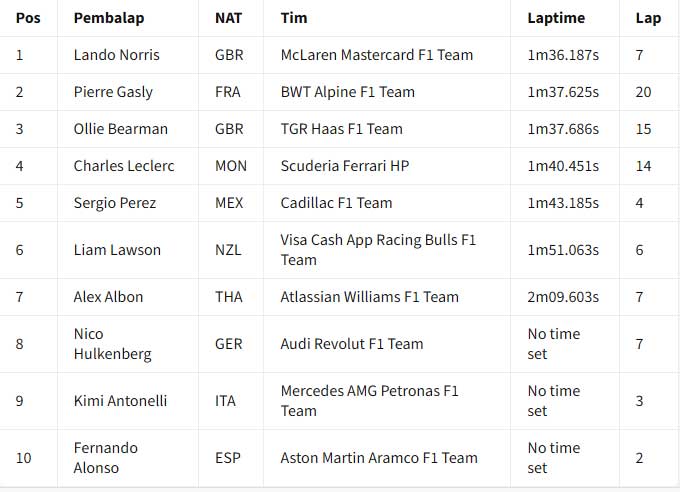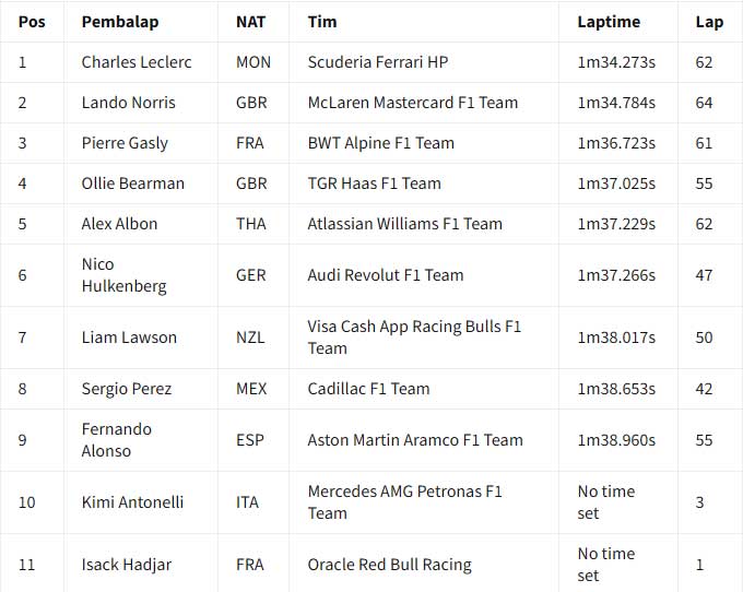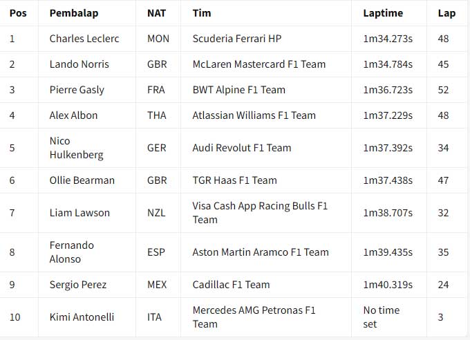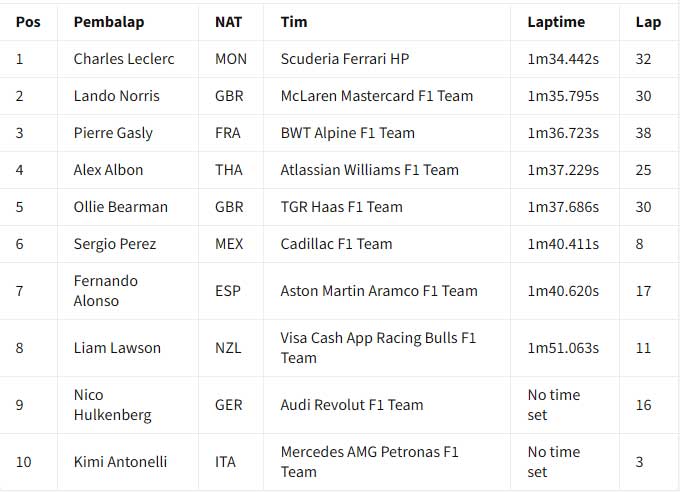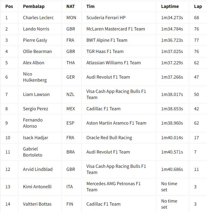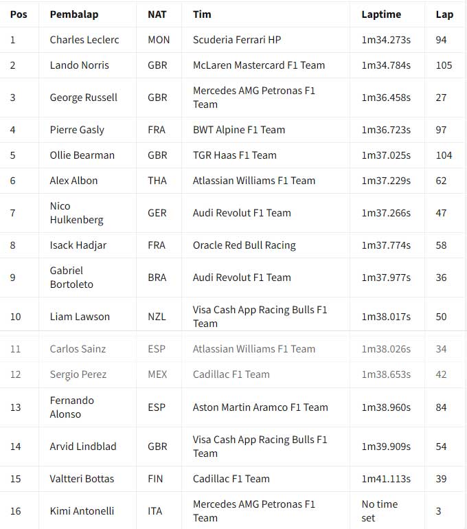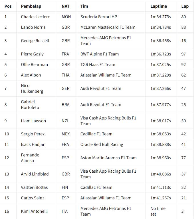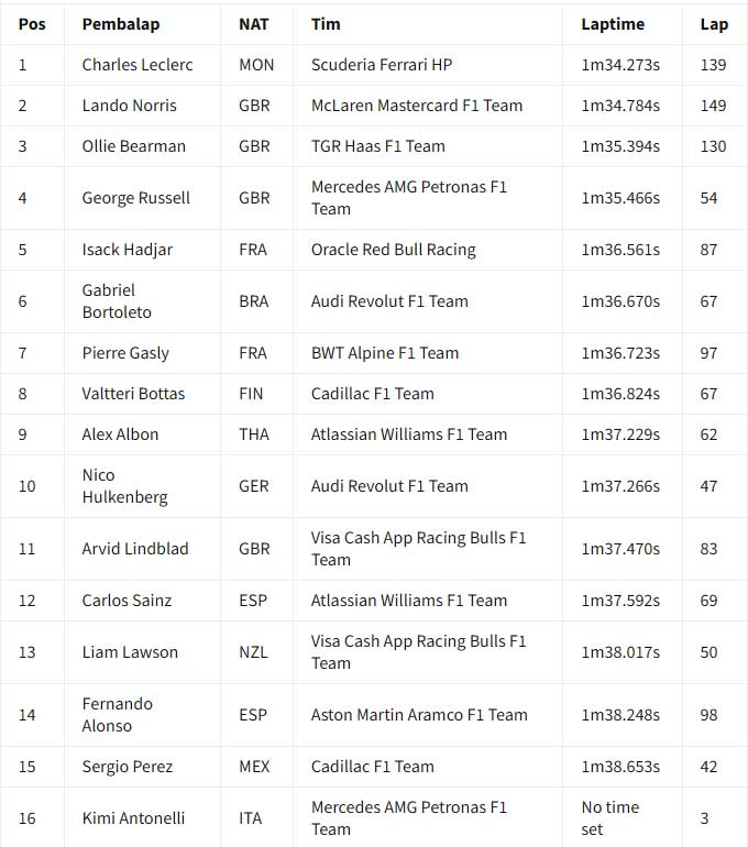 ![]() Hasil akhir hari kedua tes F1 Bahrain 2026 pada pukul 19:00 waktu setempat. Charles Leclerc memimpin hari kedua tes F1 Bahrain 2026 yang dihentikan tiga kali oleh red flag untuk Ferrari. Laptime 1 menit 32,273 detik milik Leclerc pada sesi pagi tidak terkalahkan sampai bendera finis dikibarkan pada pukul 19:00 waktu setempat. Ia mengungguli Lando Norris dari McLaren, saat kedua pebalap membukukan lebih dari 100 lap sepanjang hari Kamis. Ollie Bearman (Haas) jadi pebalap lain yang menyentuh 100 lap saat time-attack pada lap akhir membuatnya naik ke P3 di akhir sesi. Leclerc menyelesaikan 139 lap, Norris jadi yang paling banyak dengan 149 lap, sementara itu Bearman 130 lap. Posisi keempat ada George Russell yang menempuh total 54 lap pada hari yang sulit untuk Mercedes saat Andrea Kimi Antonelli hampir tidak menyelesaikan satu putaran pun di sesi pagi karena masalah mesin. Isack Hadjar juga absen di sesi pagi karena masalah pada mobil Red Bull-nya, meskipun ia berhasil menyelesaikan 87 putaran di sesi sore dan finis di posisi kelima secara keseluruhan. Gabriel Brotoleto berada di posisi keenam untuk Audi, sementara Pierre Gasly finis di posisi ketujuh setelah mengalami masalah teknis pada mobil Alpine-nya. Pebalap Prancis itu berhenti mendadak di Tikungan 1 pada jam kedua sesi sore, membuat bendera merah dikibarkan sesaat. Hal ini terjadi beberapa saat setelah penghentian lain karena kaca spion mobil Cadillac Valtteri Bottas lepas. Bottas berada di posisi kedelapan di depan Alex Albon dari Williams dan Nico Hulkenberg dari Audi kedua. Arvid Linblad berada di posisi ke-11 untuk Racing Bulls, sementara Carlos Sainz dari Williams, Liam Lawson dari Racing Bulls, Fernando Alonso dari Aston Martin, dan Perez melengkapi 15 besar. Tes F1 Bahrain 2026 - Hasil Akhir Hari Kedua (19:00) : ![]() Tes F1 Bahrain 2026 - Laptime Hari Kedua (18:00) : ![]() Tes F1 Bahrain 2026 - Laptime Hari Kedua (17:00) : ![]() Tes F1 Bahrain 2026 - Laptime Hari Kedua (16:00) : ![]() === Hasil sesi pagi === Charles Leclerc memimpin sesi pagi hari kedua tes F1 Bahrain 2026, saat Red Bull dan Mercedes mengalami masalah mekanis. Tes Bahrain berlanjut hari Kamis setelah Lando Norris dan McLaren memimpin hari Rabu. Setelah empat jam sesi pagi, Leclerc dan Ferrari berada di puncak timesheets dengan laptime 1 menit 34,723 detik, unggul 0,511 detik dari Norris. Pierre Gasly di Alpine menyelesaikan tiga besar, karena hanya sembilan pebalap yang terdaftar di sesi pertama hari Kamis. Setelah hari pertama jarak tempuh tinggi, di mana Max Verstappen menyelesaikan 135 putaran, Red Bull mengalami masalah pada hari Kamis. Sebuah "masalah rutin" pada Rabu malam selama pembangunan kembali mobil ditemukan, yang diharapkan Red Bull hanya akan membuat Isack Hadjar dua jam berlari. Namun, pada bendera kotak-kotak, Hadjar hanya berhasil melakukan putaran instalasi tepat di akhir sesi. Mercedes kembali mengalami masalah dengan mobil barunya, sehingga Andrea Kimi Antonelli dibatasi hanya tiga putaran karena masalah unit daya. Skuad menghadapi drama teknis yang serupa ketika Antonelli berada di dalam mobil pada Rabu sore. Lari hari Kamis baru berjalan 10 menit saat dihentikan sementara saat Cadillac milik Sergio Perez berhenti di sirkuit. Pemulihan cepat membuat aksi trek kembali berlangsung segera, dengan Norris memimpin di akhir jam pertama. Leclerc mengambil alih dengan 1m34.442s di akhir jam kedua, kemudian meningkatkan catatan waktunya jadi 1m34.273s di jam ketiga berjalan. Pebalap Ferrari, menyelesaikan 62 putaran sejauh ini, akan pergi tanpa tantangan sampai ke bendera kotak-kotak. Di belakang tiga besar, pebalap Haas Oliver Bearman berada di urutan keempat di depan Alex Albon di Williams. Nico Hulkenberg mengesampingkan masalah teknisnya dari kemarin untuk menempatkan 47 putaran di Audi di urutan keenam di depan Liam Lawson dari Racing Bulls. Sergio Perez berada di urutan kedelapan setelah 42 putaran di Cadillac setelah penghentian awalnya, dengan Fernando Alonso menempatkan 55 putaran di Aston Martin di urutan kesembilan. Hari kedua tes akan dilanjutkan dengan sesi sore pada pukul 3 sore sampai pukul 7 malam waktu Bahrain (19:00 - 23:00 WIB) Tes F1 Bahrain 2026 - Laptime Hari Kedua (14:00) : ![]() Tes F1 Bahrain 2026 - Laptime Hari Kedua (13:00) : ![]() Tes F1 Bahrain 2026 - Laptime Hari Kedua (12:00) : ![]() Tes F1 Bahrain 2026 - Laptime Hari Kedua (11:00) : ![]() Tim dan pebalap berada di Bahrain untuk dua tes pra-musim F1 jelang musim 2026 yang sangat dinantikan. Persiapan semakin intensif jelang era baru F1, dengan ke-11 tim berusaha memaksimalkan waktu di trek untuk memahami mobil baru mereka sebelum musim dibuka dengan Grand Prix Australia pada 8 Maret. Akan ada enam hari uji coba yang dibagi menjadi dua sesi tiga hari di Sirkuit Internasional Bahrain selama dua minggu ke depan. Uji coba pramusim pertama berlangsung antara 11-13 Februari, dengan yang kedua berlangsung antara 18-20 Februari. Williams akhirnya muncul di tes setelah melewatkan Shakedown tertutup di Barcelona. Aston Martin juga harus mengejar ketertinggalan setelah hanya memiliki satu hari penuh di Barcelona. Sumber : crash.net