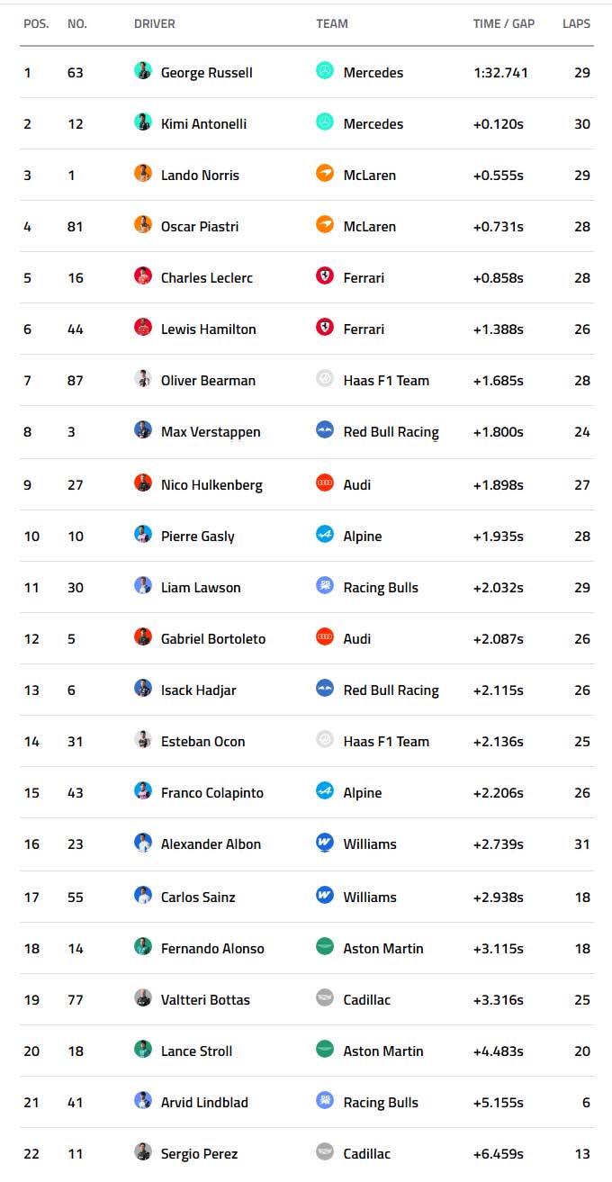 ![]() Berita F1 dari sesi latihan bebas tunggal Grand Prix China menampilkan George Russell sebagai yang tercepat dengan catatan waktu 1:32.741, mengungguli Kimi Antonelli dengan selisih +0.120 detik. Di Sirkuit Internasional Shanghai, Ferrari dengan Charles Leclerc dan Lewis Hamilton masing-masing mencatat waktu tercepat kelima dan keenam, mempertahankan keunggulan mereka atas McLaren dan Red Bull dari Melbourne. Namun, dengan Lando Norris dan Oscar Piastri masing-masing mengakhiri sesi di posisi ketiga dan keempat, MCL40 tampak lebih kompetitif. Meski demikian, keduanya tidak mampu mendekati catatan waktu Russell dan memasang ban Pirelli kompon lunak lebih lambat dibandingkan Ferrari. Dalam dua kali gangguan virtual safety car di awal sesi, Red Bull tampak agak tertinggal, dengan Max Verstappen hanya mampu mencapai posisi kedelapan di papan waktu. Oliver Bearman menunjukkan performa yang kuat, menempati posisi ketujuh untuk Haas. Sesi Arvid Lindblad terhenti setelah hanya 15 menit, sementara Carlos Sainz baru memulai sesi setelah lebih dari setengah waktu berlalu. Pembukaan Saat sesi latihan bebas satu-satunya pada akhir pekan dimulai, Franco Colapinto mengalami kesulitan mendapatkan ruang di pit lane, dengan Kimi Antonelli yang enggan memberinya jalan. Setelah keluar ke trek, pebalap asal Argentina tersebut mengalami putaran di Tikungan 9, dalam kecepatan rendah mirip dengan yang dialami Verstappen pekan lalu di Melbourne. Hamilton dan Norris hampir bersentuhan di tikungan terakhir saat mempersiapkan putaran cepat, dengan hanya satu jam sesi yang membuat waktu dan posisi di trek menjadi sangat berharga. Setelah juara dunia F1 tujuh kali tersebut membuka putarannya, dia mengalami putaran aneh di Tikungan 6, mengakibatkan flatspot pada ban medium SF-26 miliknya, dan memberi tahu timnya bahwa dia "mengunci rem" melalui radio. Setelah itu, pengawas balapan mengonfirmasi bahwa kontak minor antara Norris dan pebalap Ferrari telah dicatat; namun, kemudian tidak diselidiki lebih lanjut oleh steward. Virtual safety car keluar kurang dari 10 menit setelah dimulai, setelah terlihat puing di jalur lurus belakang yang panjang. Mercedes melanjutkan performa di Albert Park. Antonelli awalnya menjadi yang tercepat dengan 1:35, sebelum Russell mengunggulinya dengan selisih hanya 29 milidetik, keduanya menggunakan ban berkompon kuning. Tak lama kemudian, pebalap asal Inggris tersebut mencatat waktu 1:34.169. Rekan setimnya merespons dengan dua sektor ungu, tetapi bendera kuning di sektor terakhir membuatnya lebih lambat lebih dari enam persepuluh detik. Alasan gangguan, yang segera ditingkatkan menjadi VSC kedua, adalah kendaraan Racing Bulls Arvid Lindblad berhenti di bagian dalam Tikungan 14, mengakhiri sesi latihan untuk akhir pekan setelah hanya 15 menit. Paruh Kedua Carlos Sainz mengalami gangguan besar pada sesi latihannya dengan masalah data yang dicurigai, tanpa catatan waktu representatif pada tahap setengah jalan. Oliver Bearman menunjukkan sesi yang mengesankan untuk Haas di posisi keempat, tetapi segera tergeser sedikit ke bawah oleh Hamilton dengan Pirelli lunak, dan Oscar Piastri yang mencatat waktu tercepat ketiga untuk McLaren. Pebalap berusia 41 tahun tersebut segera lebih cepat dari rekan setimnya, memanfaatkan ban yang lebih cepat setelah mengorbankan set pertama, dengan semua waktu tercepat lainnya dicatat dengan ban medium. Dengan kurang dari 15 menit tersisa, Colapinto berhenti di pit lane, tepat di depan McLaren. Saat mekanik Alpine berlari untuk menjemputnya, dia berhasil menjalankan kembali A526 miliknya. Kemudian dikonfirmasi bahwa masalah tersebut adalah reset unit kontrol elektronik. Tak lama kemudian, dengan Pirelli berkompon merah terpasang pada W17 miliknya, Russell memangkas 1,3 detik dari waktu terbaiknya, mencapai 1:32.807. Leclerc, Hamilton, dan Antonelli semuanya merespons, tetapi hanya rekan setimnya yang mendekati, dengan catatan waktu satu setengah persepuluh detik lebih lambat. Sementara pebalap asal Italia tersebut mampu sedikit memperbaiki waktunya, Ferrari tidak mengalami peningkatan. Ini membuka peluang bagi McLaren, dengan Norris dan Piastri mengakhiri sesi masing-masing di posisi ketiga dan keempat setelah putaran akhir menggunakan ban lunak. Hasil Free Practice GP Tiongkok : ![]() Sumber : ligaolahraga.com