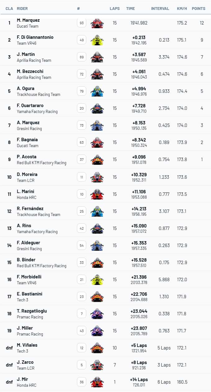 ![]() Marquez unggul dalam pertarungan ketat dengan di Giannantonio untuk meraih kemenangan pertamanya dalam enam bulan. Marc Marquez mengalahkan Fabio di Giannantonio dalam sprint Grand Prix Brasil setelah duel sengit di menit-menit akhir untuk meraih kemenangan pertamanya sejak pulih dari cedera serius. Pebalap pabrikan Ducati itu memanfaatkan kesalahan di Giannantonio di akhir balapan dengan tiga lap tersisa untuk merebut posisi terdepan, sebelum menahan serangan balik VR46 di akhir balapan dan meraih bendera finis dengan selisih hanya 0,213 detik. Hasil tersebut menandai kemenangan pertamanya dalam kontes apa pun sejak Grand Prix San Marino pada bulan September. Start sprint Goiania tertunda selama 80 menit karena petugas lintasan memperbaiki lubang besar yang muncul di lintasan lurus start/finish setelah sesi kualifikasi. Saat balapan dimulai, di Giannantonio melakukan start yang mulus dari posisi pole untuk memimpin di Tikungan 1, sementara Fabio Quartararo melompat dari posisi keempat ke kedua setelah melewati Marco Bezzecchi dan kemudian Marc Marquez di Tikungan 4. Juara bertahan MotoGP, Marquez, berhasil merebut kembali posisi kedua dari Quartararo saat pengereman di Tikungan 1 pada lap ke-3 dari 15, tetapi pada saat itu, di Giannantonio telah unggul hampir satu detik. Pebalap VR46 itu terus memperbesar keunggulannya di lap-lap awal, tetapi Marquez mulai mengejarnya sekitar pertengahan sprint, memperkecil selisih menjadi satu detik pada lap ke-7. Marquez berada dalam jarak yang memungkinkan untuk mengejar dengan sekitar lima lap tersisa, tetapi momen penentu terjadi pada lap ke-13 ketika di Giannantonio kehilangan kendali saat keluar dari Tikungan 12. Marquez langsung memanfaatkan kesempatan untuk memimpin, tetapi di Giannantonio terus mengawasinya hingga bendera finis dikibarkan. ![]() Maverick Vinales, Red Bull KTM Tech 3 Kedua pebalap mencatatkan waktu yang sama persis pada lap terakhir, tetapi Marquez tidak pernah memberi kesempatan kepada rivalnya untuk kembali merebut podium. Meskipun Quartararo memulai balapan dengan mengesankan dan berada di posisi podium di belakang di Giannantonio dan Marquez, kecepatannya dengan cepat menurun selama sprint, meninggalkannya di belakang tiga pebalap Aprilia. Perwakilan terbaik dari tim Noale adalah juara tahun 2024, Jorge Martin , yang memanfaatkan kesalahan rekan setimnya, Bezzecchi, pada lap keenam untuk merebut posisi ketiga. Hasil ini menandai kembalinya Martin ke podium setelah musim 2025 yang penuh cedera. Bezzecchi tidak mampu memperkecil jarak dengan Martin dan akhirnya finis di posisi keempat, di depan pebalap Trackhouse Aprilia teratas, Ai Ogura .Di belakang Quartararo, Alex Marquez finis sendirian di posisi ketujuh dengan motor Gresini Ducati, sementara pebalap pabrikan Ducati, Francesco Bagnaia, berhasil menahan gempuran KTM milik Pedro Acosta untuk merebut posisi kedelapan. Pebalap tuan rumah favorit, Diogo Moreira, hampir merebut poin terakhir dari Acosta, tetapi akhirnya harus puas dengan posisi ke-10. Pebalap Gresini tahun kedua, Fermin Aldeguer, mengalami insiden selip roda yang cukup parah saat kembali ke MotoGP dan terlempar ke posisi ke-20 di awal balapan, sebelum akhirnya pulih dan finis di posisi ke-14. Pebalap rookie Pramac, Toprak Razgatlioglu, juga kehilangan beberapa posisi di lap pembuka dan hanya mampu finis di urutan ke-18. Johann Zarco dari tim LCR dan pebalap pabrikan Honda, Joan Mir, mengalami kecelakaan di lap-lap awal, sementara pebalap Tech3, Maverick Vinales, juga bergabung dengan mereka dalam daftar pebalap yang mundur dari balapan. Hasil Sprint Race MotoGP GP Brasil ![]() Sumber : id.motorsport.com