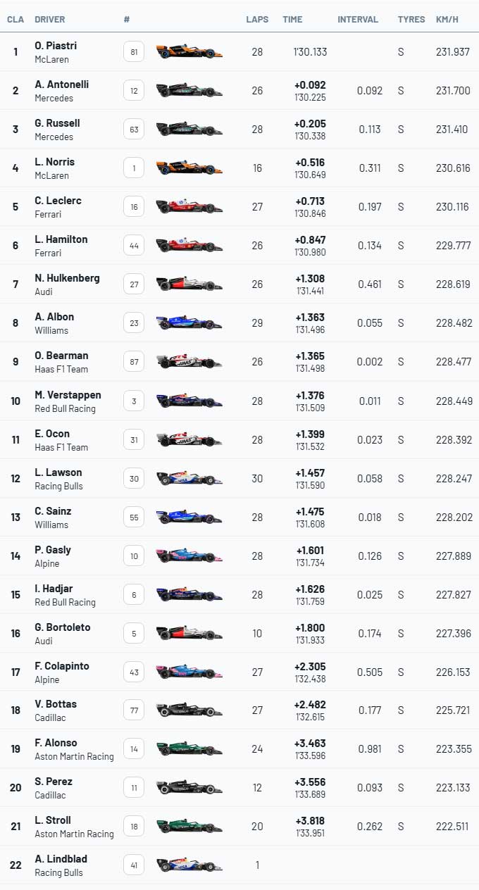![]() Mercedes meraih posisi 1-2 di sesi latihan pertama di Suzuka, tetapi Piastri menjadi yang tercepat di FP2, setelah mengendalikan sesi tersebut sepanjang waktu. Oscar Piastri menghentikan dominasi Mercedes dengan mengungguli Kimi Antonelli untuk memimpin sesi latihan kedua Grand Prix Formula 1 Jepang di Suzuka. Pebalap McLaren itu mencatatkan waktu 1m30.133s, 0.092s lebih cepat dari Antonelli, yang rekan setimnya di Mercedes, George Russell, melengkapi tiga besar setelah mendominasi sesi latihan pembuka. Sesi FP1 menyaksikan pemimpin klasemen kejuaraan mengungguli finis 1-2 Silver Arrows , tetapi Mercedes kesulitan mendapatkan pijakan di sesi kedua hari Jumat karena Piastri tampil mengesankan dengan MCL40-nya. Hal itu terjadi sejak lap pembukaannya saat ia menggeser pemimpin sebelumnya, Russell, dalam 10 menit pertama, mencatatkan waktu 1m31.495s yang 0,073s lebih cepat daripada Mercedes yang menggunakan ban medium. Meskipun tidak sepenuhnya bertahan lama – dengan Piastri, Antonelli, dan Charles Leclerc saling bergantian mencatatkan waktu tercepat di awal sesi latihan – pebalap Australia itu menegaskan kendalinya saat sesi latihan dengan ban lunak dimulai. Pada putaran pertama Piastri dengan ban bergaris merah, ia mencetak lap tercepat di sesi tersebut, yaitu 1m30.133s setelah 23 menit, yang membuatnya satu detik lebih cepat daripada catatan waktunya dengan ban medium. ![]() Andrea Kimi Antonelli, Mercedes Namun, catatan waktu tercepat Antonelli juga diraih pada lap pertamanya menggunakan ban lunak; jendela waktu untuk simulasi kualifikasi di FP2 cukup singkat karena para pebalap kembali menggunakan ban medium menjelang akhir sesi. Pebalap Italia itu, yang meraih kemenangan grand prix pertamanya di China pada balapan sebelumnya, mencatatkan waktu 1m30.225s yang membuatnya 0.113s lebih cepat dari Russell, yang merupakan satu-satunya pemenang balapan lainnya di tahun 2026. Rekan setim Piastri, Lando Norris, kemudian menempati posisi keempat dalam sesi yang cukup bermasalah bagi juara dunia bertahan tersebut, yang melewatkan 23 menit pertama. Hal itu disebabkan oleh kebocoran hidrolik pada McLaren, dan meskipun ia menyelesaikan lap pengenalan lintasan sebelum pertengahan sesi, Norris sebenarnya baru mencatatkan waktu yang sebenarnya pada paruh kedua sesi. Pada percobaan pertamanya, ia menempati posisi keenam dengan ban medium sebelum mengganti ban dengan ban lunak menjelang akhir sesi, sementara yang lain menggunakan ban kuning, dan mencatatkan waktu 1m30.649s dalam sesi FP2 yang kuat bagi McLaren. Hal itu sangat dibutuhkan setelah awal yang lambat dalam upaya mempertahankan gelar, yang termasuk dua kali tidak bermain di Shanghai, ditambah dengan kegagalan Piastri untuk memulai pertandingan pembuka di Melbourne di mana Norris finis di urutan kelima. ![]() Lando Norris, McLaren Norris finis di FP2 dengan selisih 0,516 detik dari rekan setimnya, sementara Leclerc melengkapi lima besar untuk Ferrari, yang merupakan penantang terdekat Mercedes di dua putaran pembuka era regulasi baru. Leclerc mencatatkan waktu 1 menit 30,846 detik, tujuh persepuluh detik di belakang Piastri, sementara rekan setimnya, Lewis Hamilton, menempati posisi keenam setelah meraih podium pertamanya untuk Ferrari pada balapan sebelumnya. Hamilton jarang menjadi ancaman di sesi latihan kedua karena ia kesulitan mendekati catatan waktu terbaik, juara dunia tujuh kali itu menyelesaikan sesi tersebut 0,847 detik di belakang Piastri. Sepuluh besar dilengkapi secara berurutan oleh Alex Albon, Oliver Bearman, dan Max Verstappen, yang sekali lagi kesulitan dengan RB22-nya, melaporkan "understeer saya sangat parah". Rekan setimnya, Isack Hadjar, juga kesulitan dan finis di posisi ke-15, dalam sesi latihan yang secara umum berjalan tanpa masalah, dengan satu-satunya bendera kuning yang muncul sebentar karena Albon. Itu terjadi di awal balapan ketika dia menghentikan mobil Williams-nya tepat setelah puncak Tikungan 1 karena masalah gas, meskipun dia dengan cepat melanjutkan balapan lagi saat bendera hijau masih berkibar hingga akhir. Arvid Lindblad adalah satu-satunya pebalap yang gagal mencatatkan waktu putaran, karena pebalap rookie Racing Bulls itu meninggalkan garasinya lebih awal tetapi kemudian masalah pada gearbox muncul dengan cepat, menyebabkan ia harus mundur lebih awal. Hasil FP2 F1 GP Jepang 2026 : ![]() Sumber : id.motorsport.com