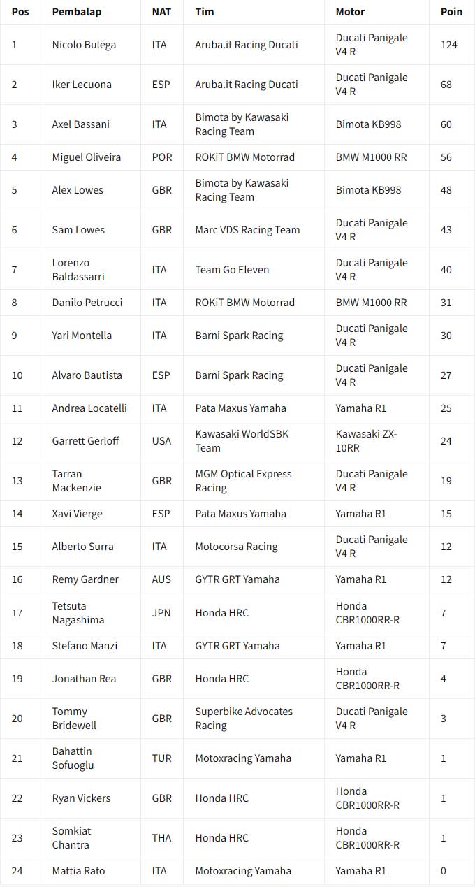 ![]() Nicolo Bulega kembali menegaskan dominasinya di ajang WorldSBK musim 2026 setelah berhasil melanjutkan tren kemenangan yang telah ia bangun sejak awal musim, dengan penampilan yang sangat meyakinkan di sirkuit Portimao yang menjadi salah satu seri penting dalam kalender kejuaraan tahun ini. Keberhasilan Nicolo Bulega di Portimao tidak hanya sekadar kemenangan biasa, melainkan menjadi bukti konsistensinya dalam menjaga performa di setiap balapan, sehingga ia mampu memperkuat posisinya di puncak klasemen sementara dengan keunggulan yang semakin sulit dikejar oleh para pesaingnya. Dengan menyapu bersih seluruh tiga balapan yang digelar sepanjang akhir pekan di Portimao, Nicolo Bulega menunjukkan dominasi penuh atas para rivalnya, di mana ia tidak memberikan banyak celah bagi pebalap lain untuk merebut kemenangan dalam setiap sesi yang berlangsung kompetitif tersebut. Hasil sempurna tersebut membuat Nicolo Bulega kini unggul sejauh 56 poin dari pesaing terdekatnya, Iker Lecuona, yang harus bekerja keras untuk tetap menjaga posisinya di klasemen sementara meskipun tertinggal cukup jauh dari pemuncak klasemen saat ini. Iker Lecuona sendiri masih mampu mempertahankan posisi kedua di klasemen, dengan keunggulan atas Axel Bassani yang berada tepat di bawahnya, sehingga persaingan untuk posisi dua besar masih tetap terbuka dan berpotensi berubah seiring berjalannya musim. Sementara itu, Axel Bassani yang menempati posisi ketiga klasemen juga masih memiliki peluang untuk memperbaiki posisinya, mengingat selisih poin dengan Iker Lecuona tidak terlalu jauh, sehingga persaingan di papan atas tetap berlangsung ketat di luar dominasi Nicolo Bulega. Di sisi lain, Miguel Oliveira berhasil naik ke posisi keempat dalam klasemen sementara setelah menunjukkan performa yang sangat solid di Portimao dengan meraih tiga podium, sebuah pencapaian yang menjadi dorongan besar bagi posisinya dalam persaingan musim ini. Keberhasilan Miguel Oliveira mengamankan tiga podium dalam satu akhir pekan tersebut menunjukkan peningkatan performa yang signifikan, sehingga ia mampu melampaui beberapa pebalap lain dan kini berada tepat di belakang Axel Bassani dalam urutan klasemen sementara. Selain itu, Alex Lowes juga mengalami kenaikan posisi di klasemen dengan kini menempati peringkat kelima, setelah menunjukkan hasil yang cukup konsisten dalam beberapa balapan terakhir yang membuatnya mampu mengumpulkan poin penting sepanjang musim berjalan. Sementara itu, Sam Lowes harus puas berada di posisi keenam dalam klasemen sementara, meskipun ia tetap menunjukkan performa yang kompetitif di lintasan, namun hasil yang diraihnya belum cukup untuk membawanya naik lebih tinggi dibandingkan para pebalap lain di atasnya. Klasemen WorldSBK 2026 Usai Race 2 Putaran Portugal : ![]() Sumber : crash.net