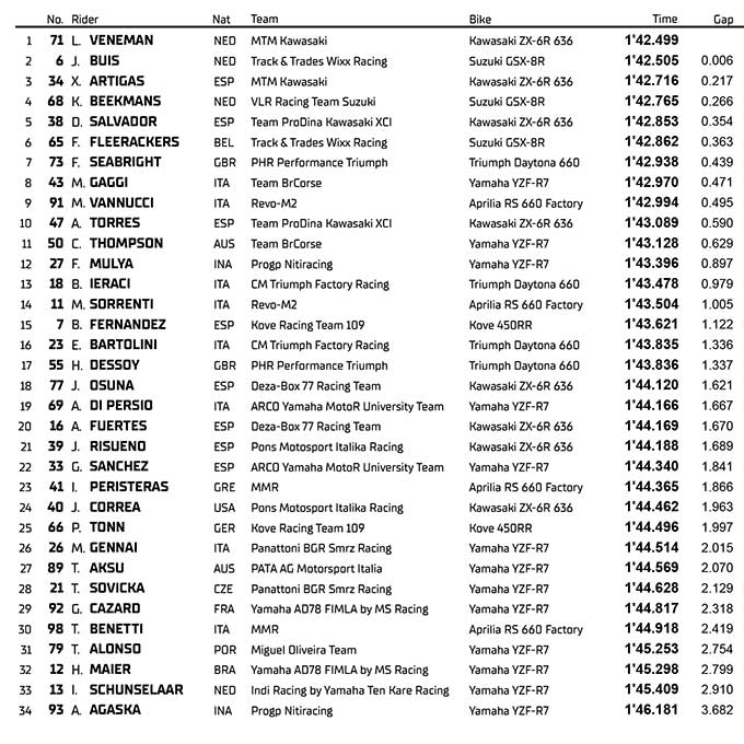 Kali ini, ia berada di posisi kedua karena catatan waktu 1‘42.505s, sedikit terlalu lambat untuk meraih pole. Xavi Artigas (MTM Kawasaki) bertekad untuk lolos kualifikasi dengan baik di sesi Superpole untuk Race 1 hari Sabtu setelah dua kali gagal meraih podium di Portimao meskipun berjuang untuk posisi podium. Ia memulai balapan dari posisi ketiga berkat catatan waktu 1‘42.716s.