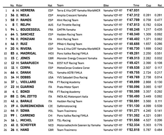 Kedua pebalap tersebut berada di bawah rekor lap yang ada di sirkuit Belanda saat mereka berduel memperebutkan posisi pole. Maria Herrera (Terra & Vita GRT Yamaha WorldWCR) meraih pole position di FIM Women‘s Circuit Racing meskipun mendapat perlawanan sengit dari Beatriz Neila (Ampito Crescent Yamaha) di sirkuit TT Assen yang menakjubkan.