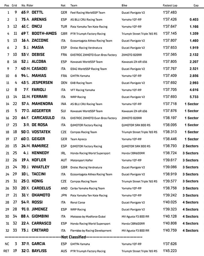 JERMAN DI PUNCAK PODIUM: Oettl menjadi pemenang Jerman pertama dalam delapan tahun. Beragam pebalap saling bersaing di puncak klasemen, dengan enam pebalap berada dalam selisih satu detik pada Lap 8. Philipp Oettl menyalip Alessandro Zaccone (Ecosantagata Althea Racing Team) untuk posisi kedua di Tikungan 1 Lap 8, menempel di belakang Can Oncu saat pebalap Jerman itu berupaya meraih kemenangan pertamanya. Ia memimpin di awal Lap 10 dan mempertahankan keunggulan hingga bendera merah dikibarkan karena kecelakaan yang melibatkan Roberto Garcia (GMT94 Yamaha), yang kemudian dinyatakan fit dengan memar di kaki kirinya, dan lecet di paha kirinya. Karena balapan telah menempuh lebih dari 2/3 dari total jaraknya, hasilnya pun ditetapkan, dan Oettl dinobatkan sebagai pemenang untuk pertama kalinya di WorldSSP. Di belakangnya, Albert Arenas melaju ke Tikungan 1 di posisi pertama, dan Can Oncu melesat naik untuk merebut posisi pertama di Tikungan 4 setelah memulai dari posisi ke-12. Kedua pebalap tersebut berebut posisi pertama di awal balapan saat mereka saling menyalip dengan berani untuk memimpin balapan hingga Oettl berhasil melewatinya, menggeser Arenas ke posisi kedua dan Oncu ke posisi ketiga. ZACCONE MENYAMAKAN REKORNYA: Pebalap Italia itu kembali menduduki posisi ke-5 untuk pertama kalinya dalam sepuluh tahun. Tom Booth-Amos (PTR Triumph Factory Racing) berhasil memperbaiki posisinya dari start ke-11 menjadi finis di posisi ke-4. Alessandro Zaccone meraih hasil terbaiknya sejak dua kali finis di posisi ke-5 pada tahun 2016. Assen merupakan langkah maju yang menggembirakan bagi Juara MotoE ini, dan ia patut diperhatikan ke depannya. Jaume Masia (Orelac Racing VerdNatura) tampak kurang nyaman dengan kondisi lintasan yang berubah-ubah, dan ia melihat posisi start ke-2-nya berubah menjadi finis di posisi ke-6; namun, ia tetap mempertahankan keunggulan poinnya di Kejuaraan. ZXMOTO MASUK TUJUH BESAR: Debise finis 2,2 detik di belakang P1 Valentin Debise (EASTROC ZXMOTO Factory Evan Bros Racing) meraih hasil terburuknya sejak Phillip Island; namun, ini merupakan bukti betapa kuatnya musimnya sejauh ini, karena ia finis di posisi ke-7 dalam kondisi Race 2 yang sulit. Jeremy Alcoba (Kawasaki WorldSSP Team) mempertahankan rekor sepuluh besarnya saat ia bertarung dengan Debise, finis di posisi ke-8 di depan rekan setimnya Dominique Aegerter, yang finis di posisi ke-15. Mattia Casadei (D34G WorldSSP Racing Team) memanfaatkan cuaca dan meraih hasil terbaiknya musim ini sejauh ini di posisi ke-9, bahkan sempat melaju hingga posisi ke-2 di awal balapan. Lucas Mahias (GMT94 Yamaha) tidak seberuntung di Race 2 seperti di Race 1, finis di posisi ke-10 merupakan hasil terburuk kedua musim ini setelah finis di posisi ke-24 pada balapan pembuka musim. Hasil Race 2 WorldSSP Belanda 2026 : ![]() Sumber : worldsbk.com